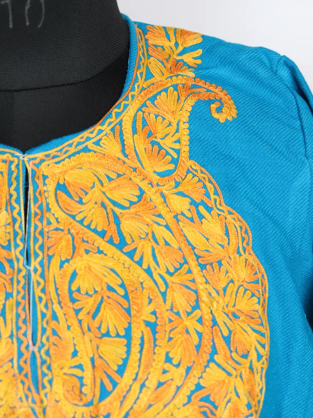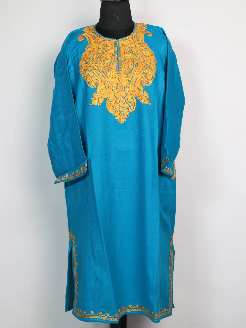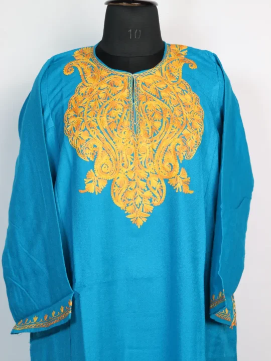 A vibrant blue Cashmilon wool pheran beautifully decorated with detailed badam-shaped Aari embroidery in rich golden tones. It has a chest size of 48 inches and a length of 42.5 inches.