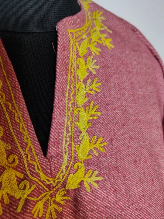 This pink colour Kashmiri feran is crafted in tweed and highlighted with floral aari embroidery placed at the neckline. It reflects Kashmiri grace, tailored in chest size 48 inches and length 30 inches—offering a soft and warm winter fit.