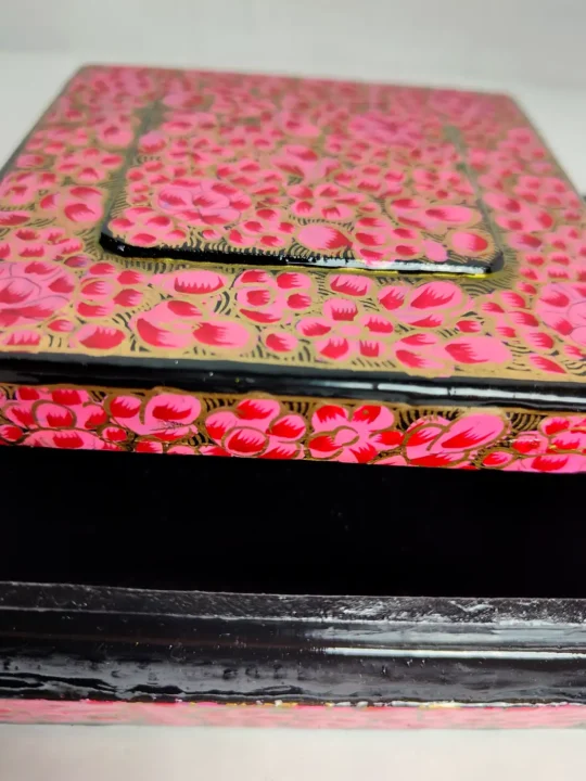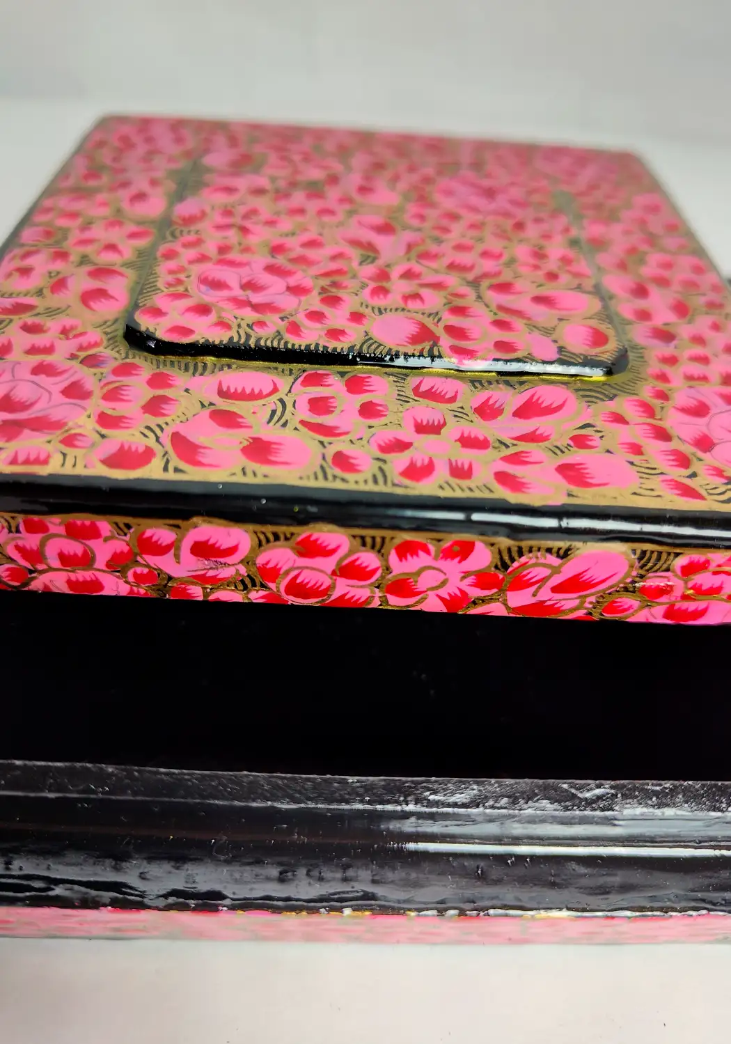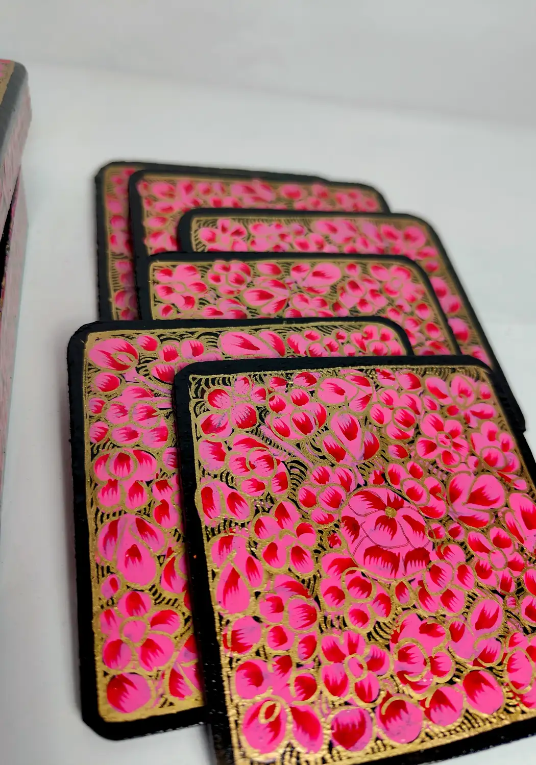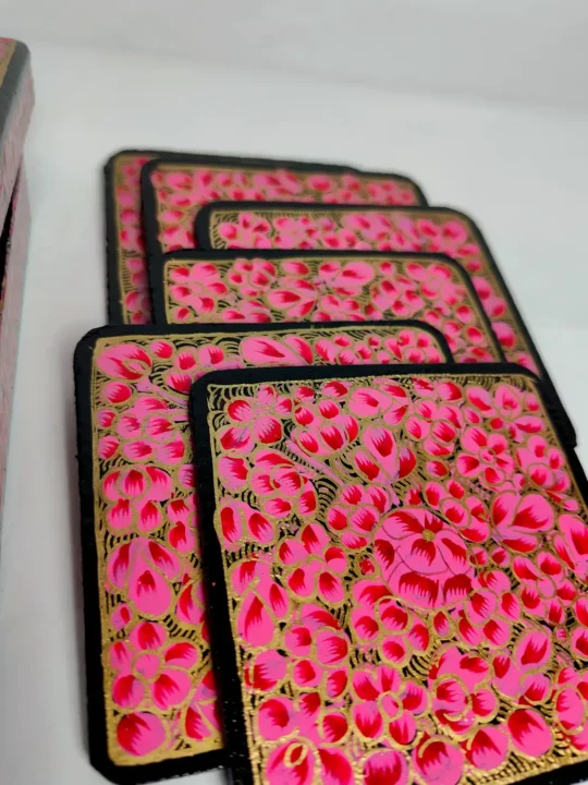 This coaster set brings together six square pieces inside a box, each decorated with pink hue floral paper machie embroidery. The overall look feels clean and artistic, which makes it an easy addition for those who appreciate small touches of traditional Kashmiri design.