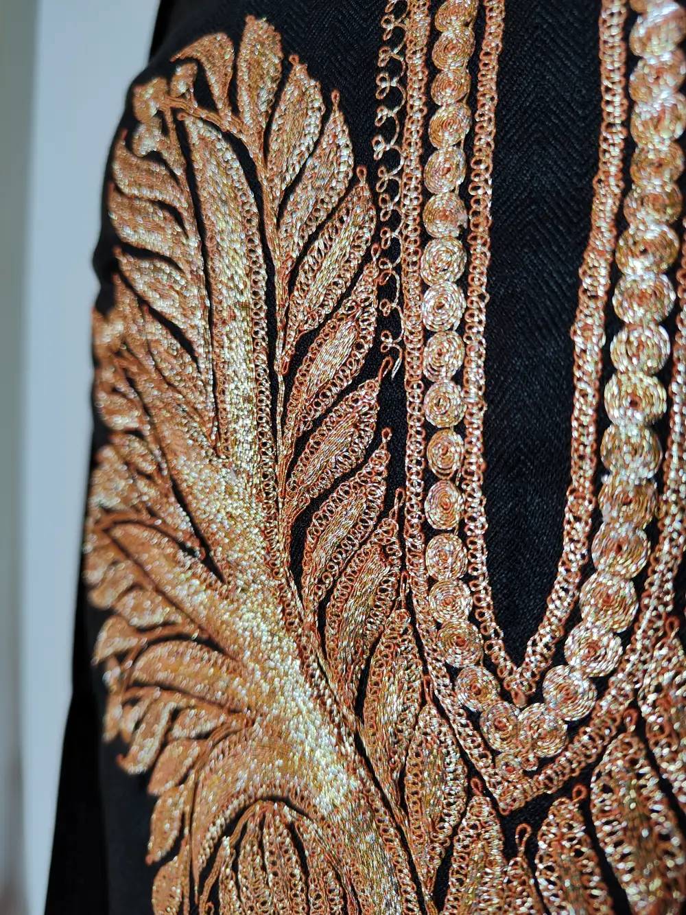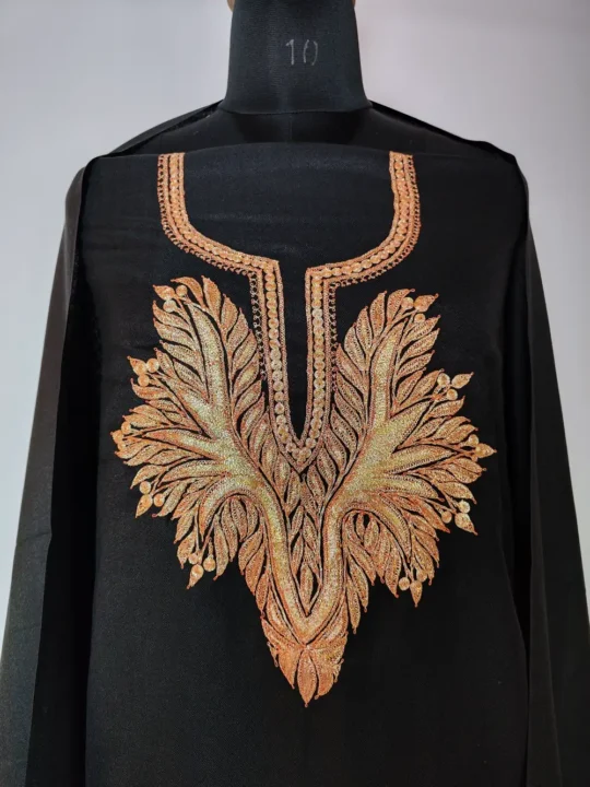 Acrowool 3pc unstitched suit fabric in black is enhanced with Botte Tilla kadhai at the neckline and it is offered as a 3pc set including dupatta and salwar kameez. These come unstitched so you may stitch it to your fit.