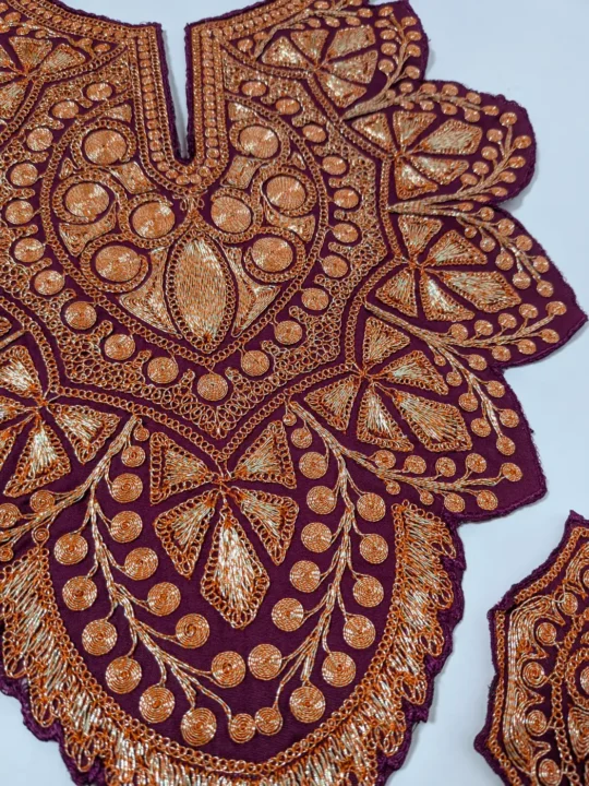 This purple hue patch set features leafy tilla embroidery across the neck patch and sleeve patches, while the lace runs with continuous detailing. This combination creates a complete traditional set where each element supports the overall design beautifully.