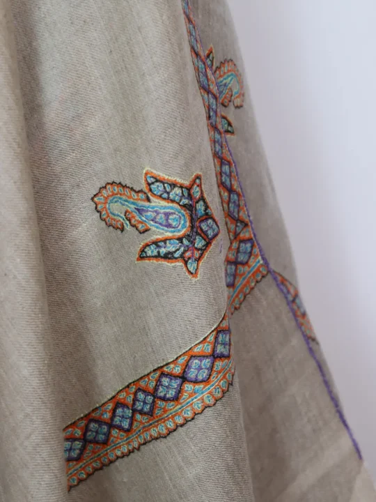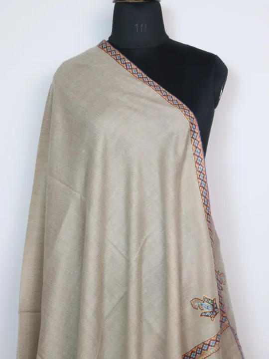 Woven from pure Kashmiri pashmina, this beige shawl offers a smooth, lightweight drape with natural warmth. It features hand Sozni embroidery along the borders, showcasing delicate floral motifs that reflect the quiet elegance of traditional Kashmiri craftsmanship.