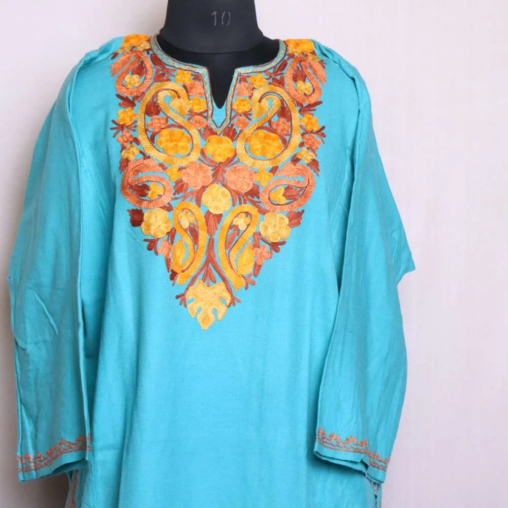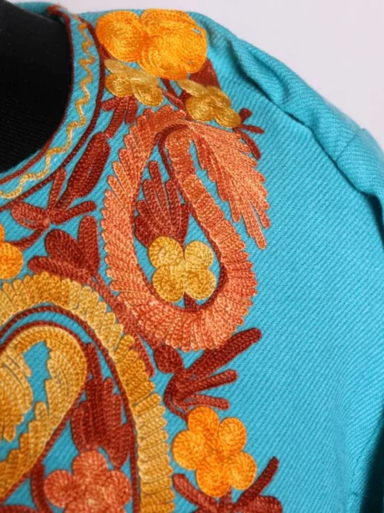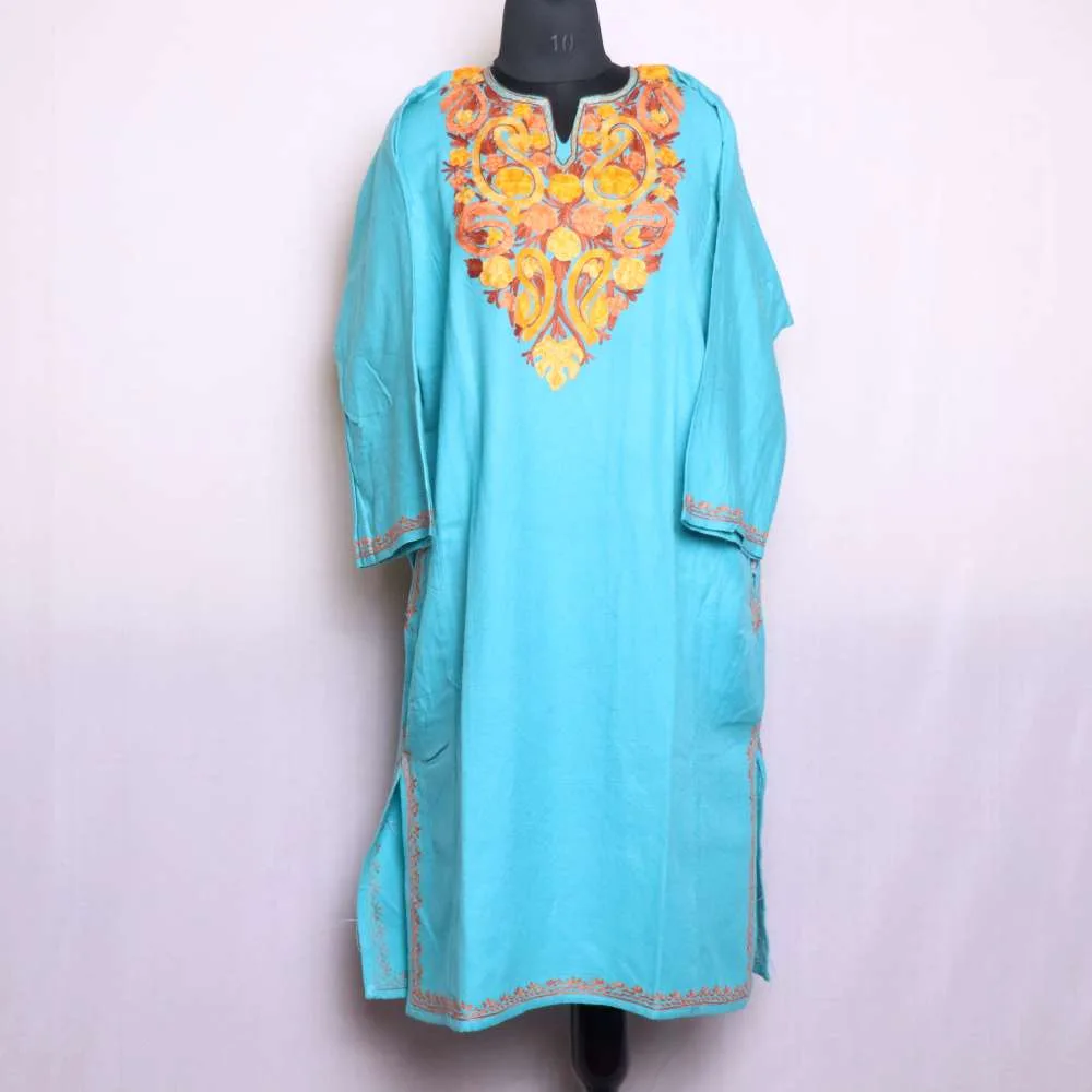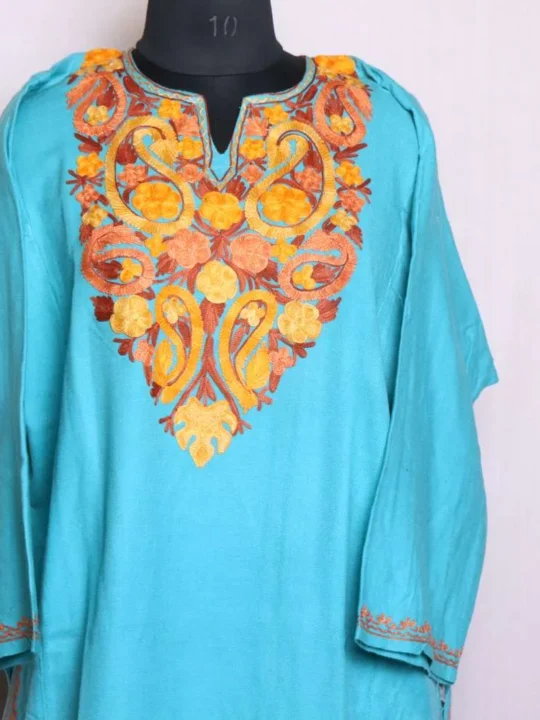 This pheran is designed to keep you comfortable and elegant. It features soft Cashmilon fabric and exquisite Aari work. Whether for family gatherings or everyday wear, this piece is a versatile addition to your collection.