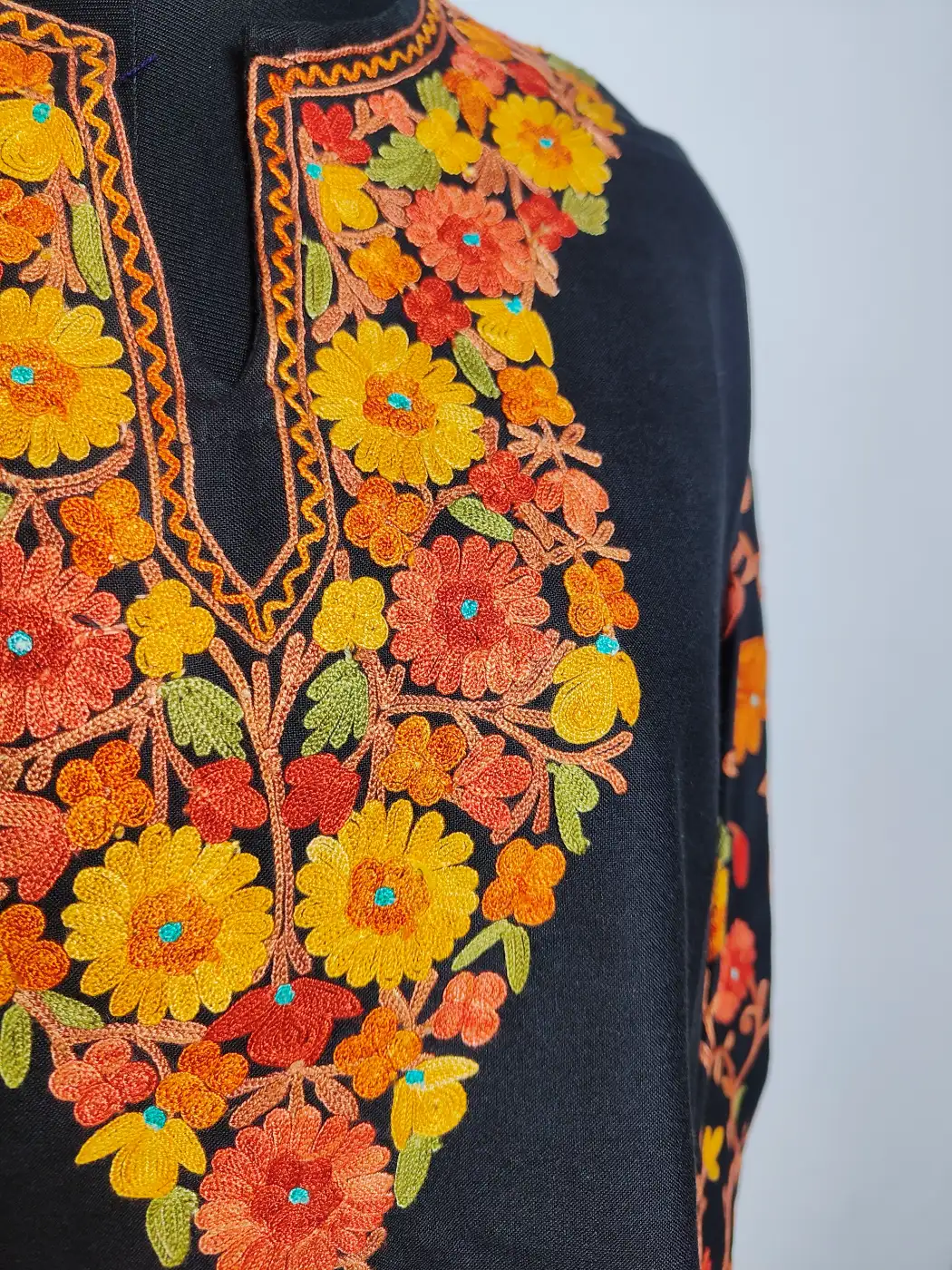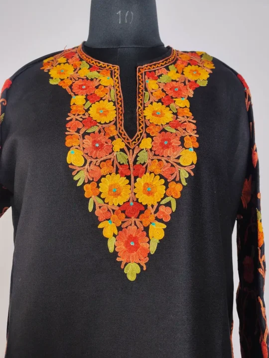 Crafted in ruby cotton for warm days, this black colour kashmiri work kurti features Kashmiri aari embroidery at neckline and sleeves in floral motifs. Its 2XL size makes it comfortable daily wear.