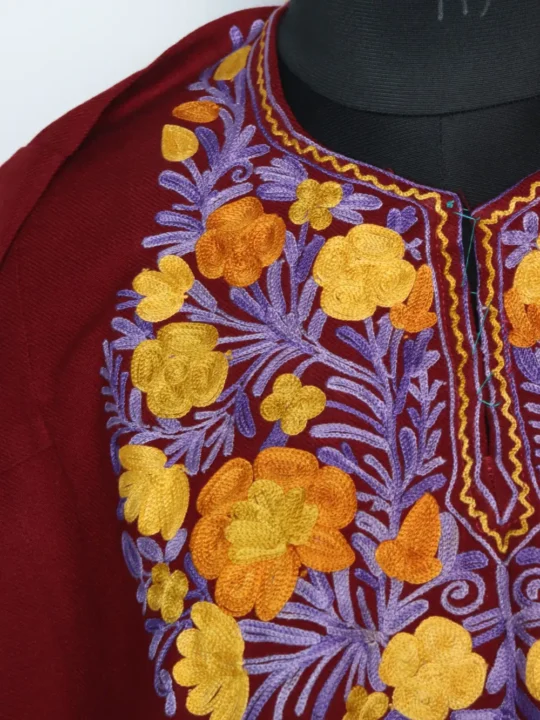 Tailored in cashmilon wool for winter wear, this Kashmiri traditional dress comes in maroon colour. It is detailed with aari embroidery featuring floral motifs on neckline.