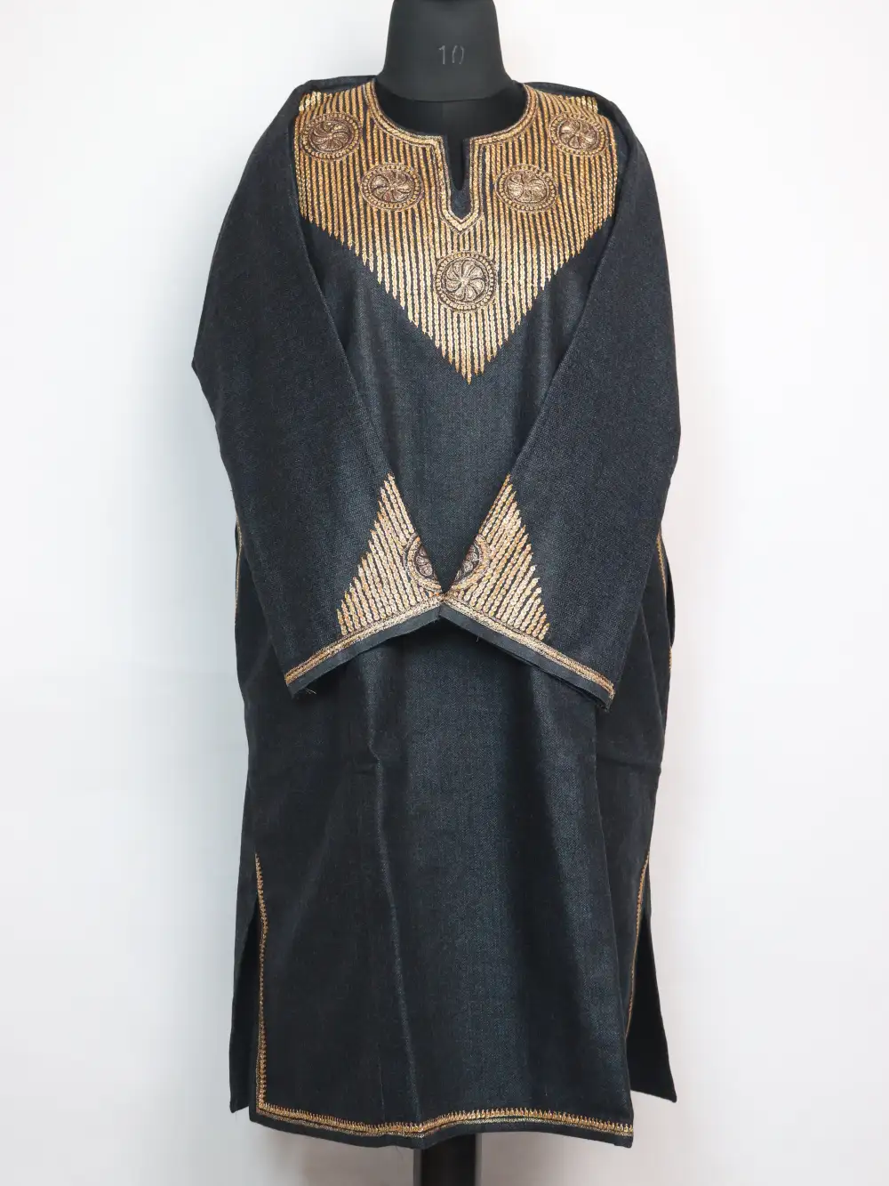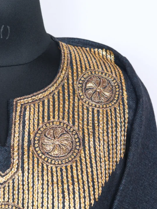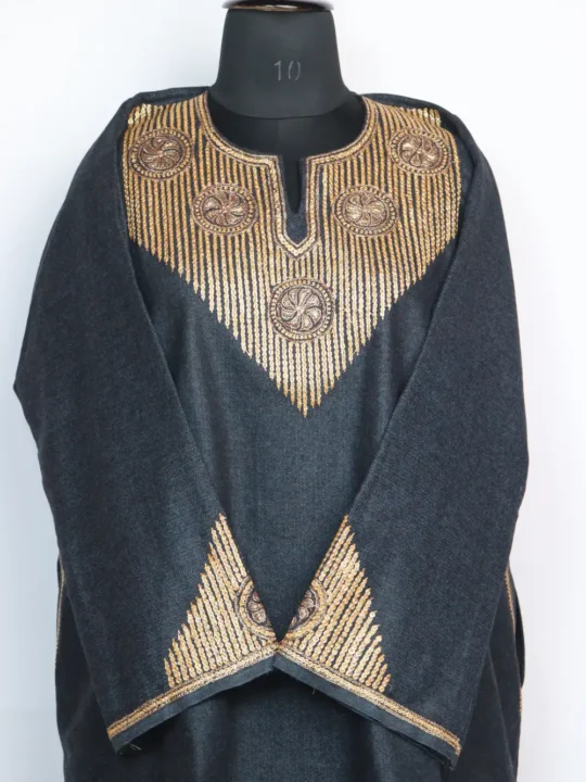 A dark grey Kashmiri feran adorned with botte tilla embroidery in striped patterns at the neckline. It comes with pockets on both side for convenience. This feran reads tidy and warm and it offers a modest Kashmiri neck detail that works well with layered winter looks.