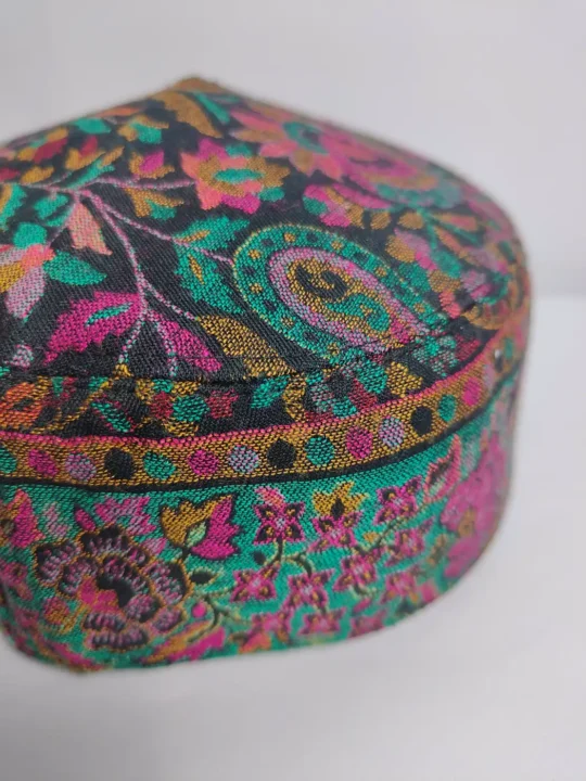 Traditional kani shawl weaving forms the base of this classic Kashmiri kani cap. The crown of this black topi carries delicate floral embroidery while continuous decorative motifs run across the sides.