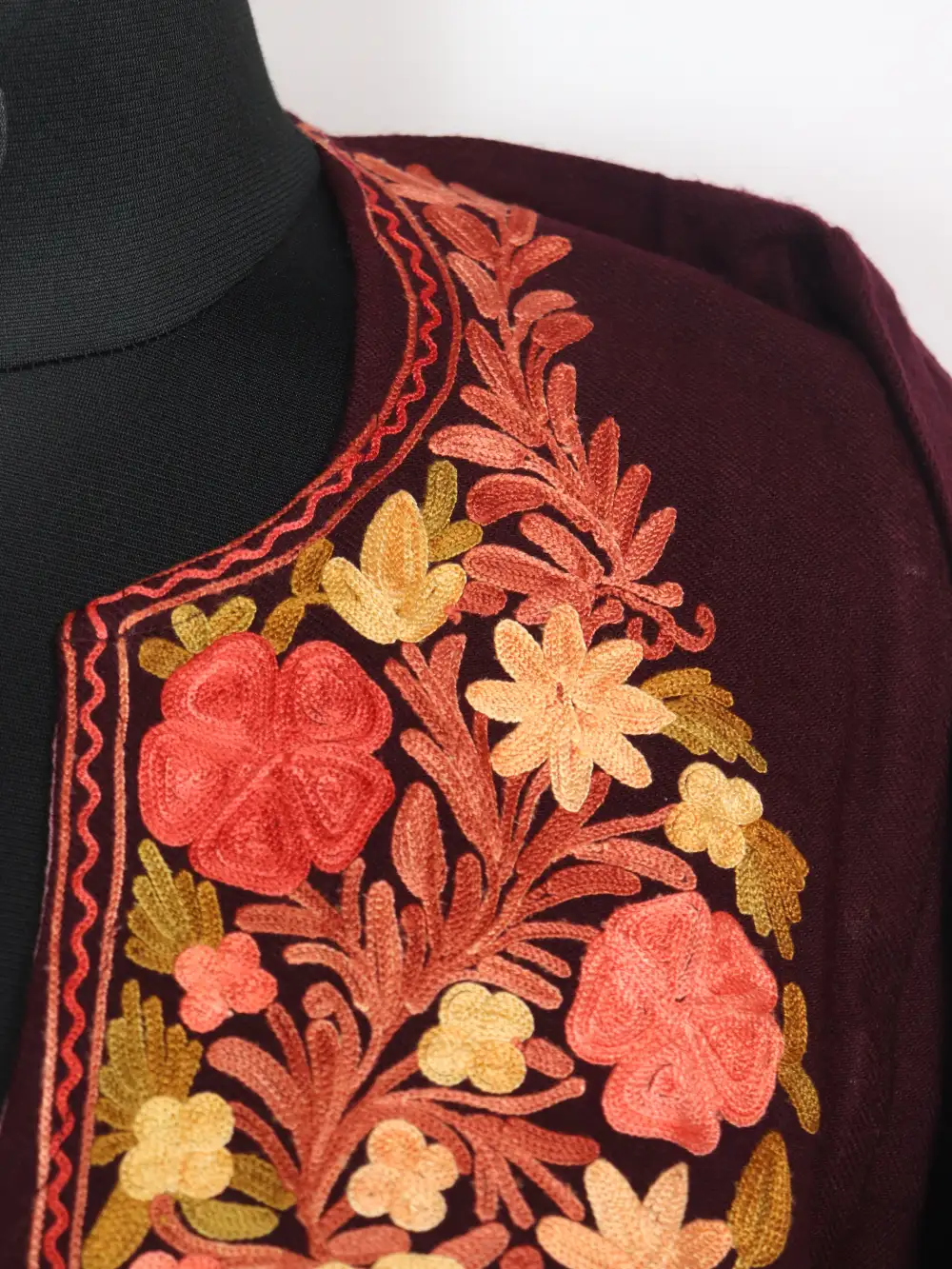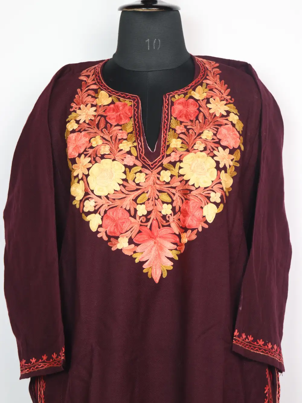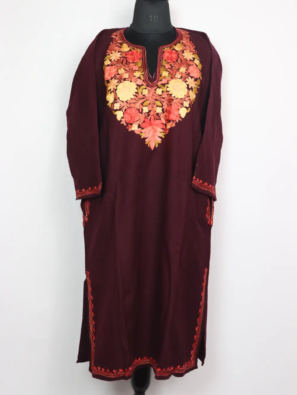 Cashmilon wool kashmiri traditional pheran dress in wine hue balances neat tailoring with everyday practicality. It features pockets both side so the piece fits modern use. Aari embroidery at the neckline arranges in floral motifs that enhance its overall elegance.