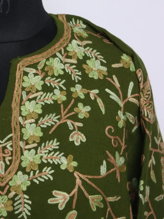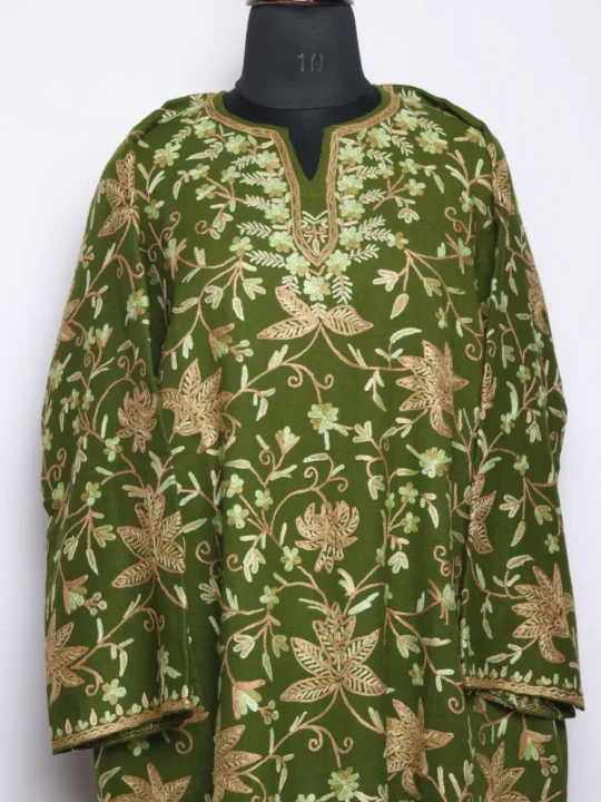 Olive green Raffal Wool, all over hand Aari work and both side pockets make this Kashmiri dress or pheran both refined and useful. This phiran kashmiri dress carries a clear Kashmiri handwork signature all-over it.