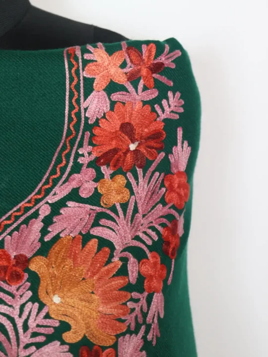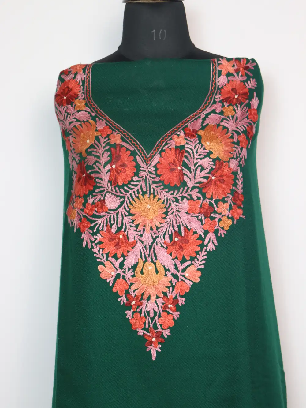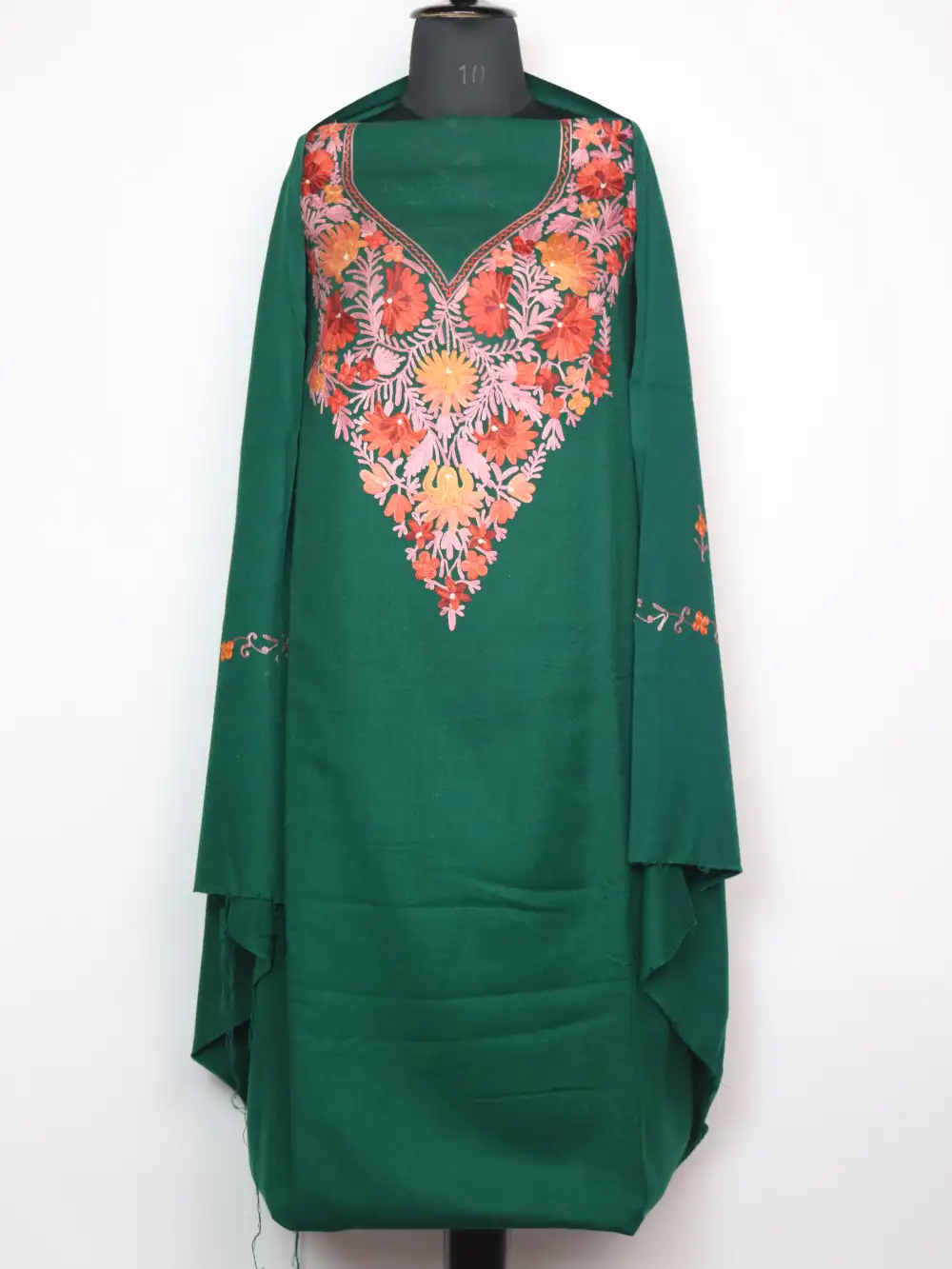 This unstitched cashmilon wool suit in a Dark Green color decorated with posh bagh aari embroidery around the neckline. Comes in a 3-piece set with kameez, salwar, and dupatta, it can be stitched as per your choice.