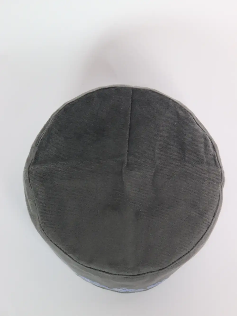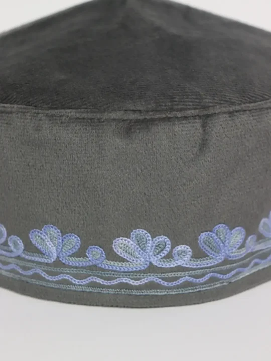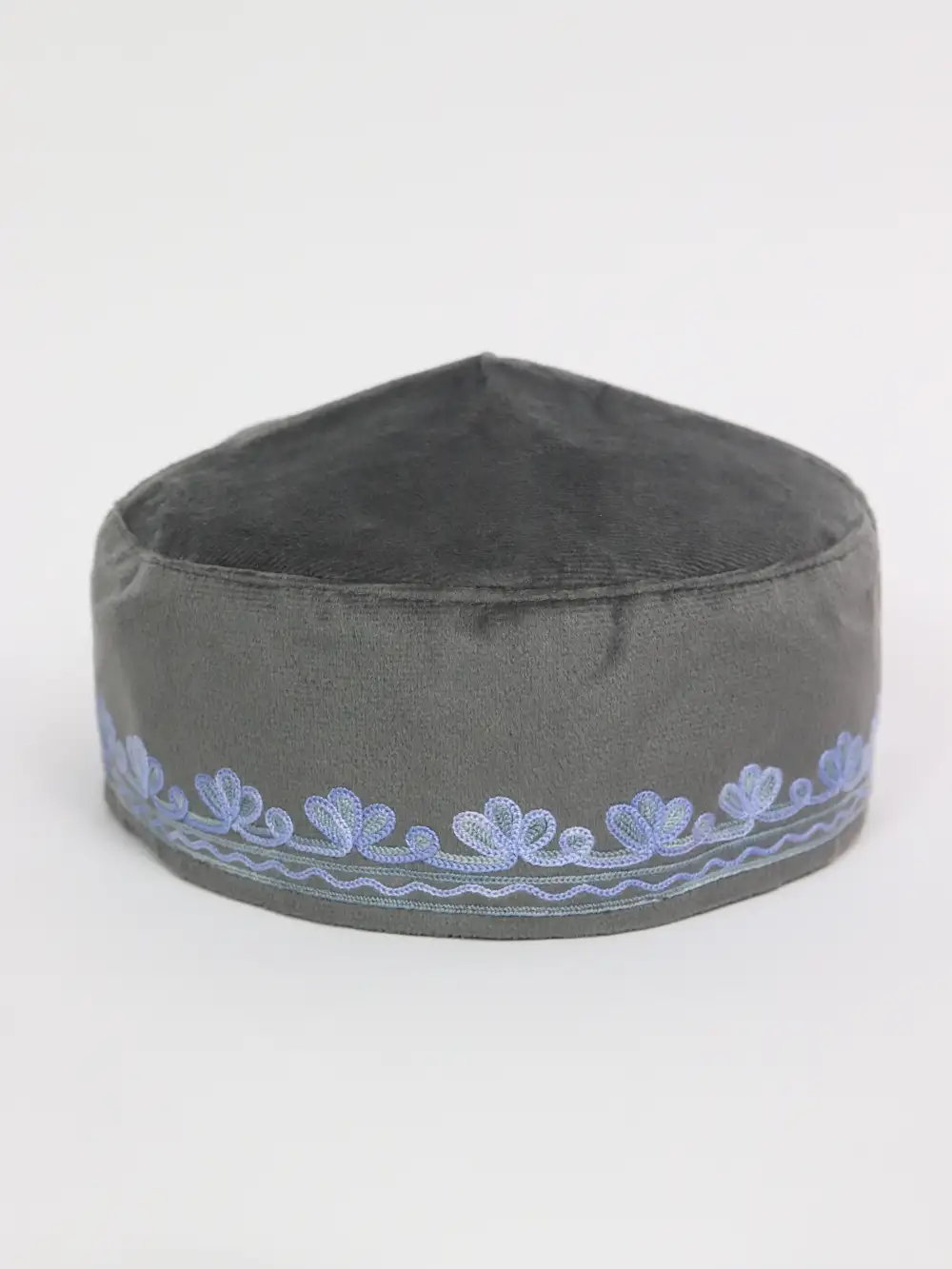 Velvet gives this dark grey cap an anmol appearance, complemented by Aari embroidery tracing a border with continuous styling.