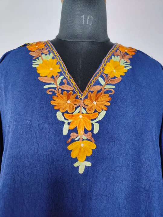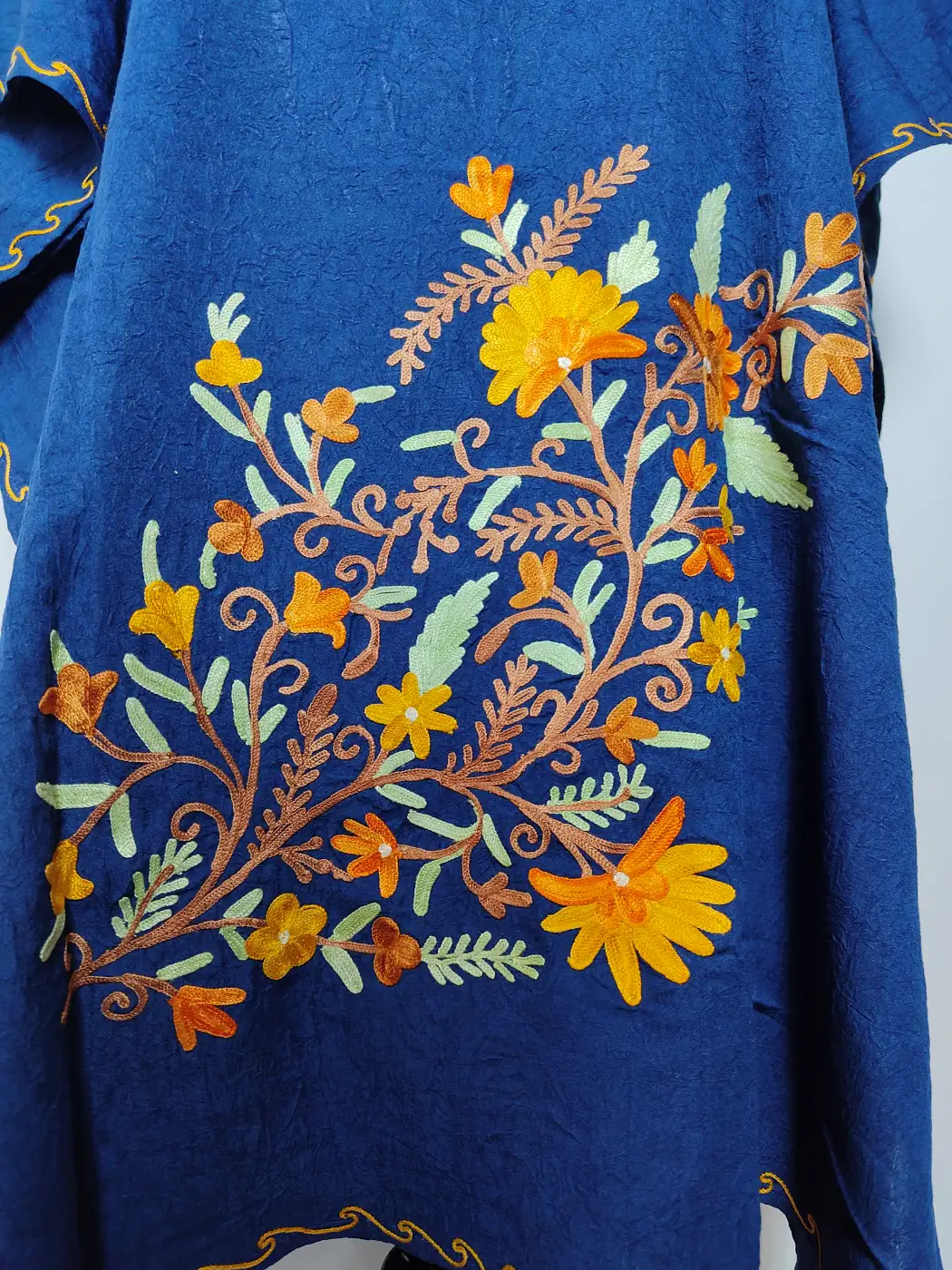 Made in breathable dark blue crush cotton, this Kashmiri kaftan set brings together comfort and detail. The neckline carries floral embroidery, while huge florals trace the front panel. With kaftan and trouser included, it feels easy to wear and rooted in tradition.