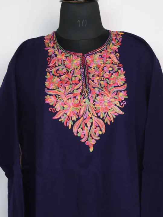 Cashmilon Wool kurti design in dark blue displays Aari embroidery at the neckline and holds a modest charm. Its chest size 46 inches and length 32 inches offer a relaxed fall; this aari work kurti design pairs easily with shawls and trouser for a quiet Kashmiri aesthetic.