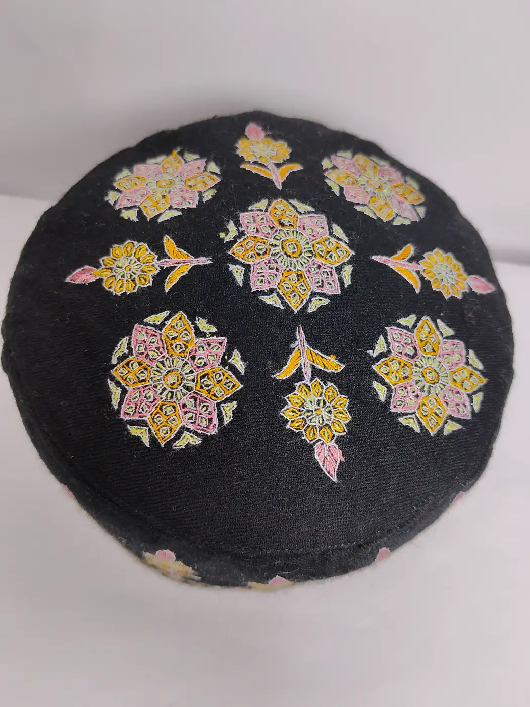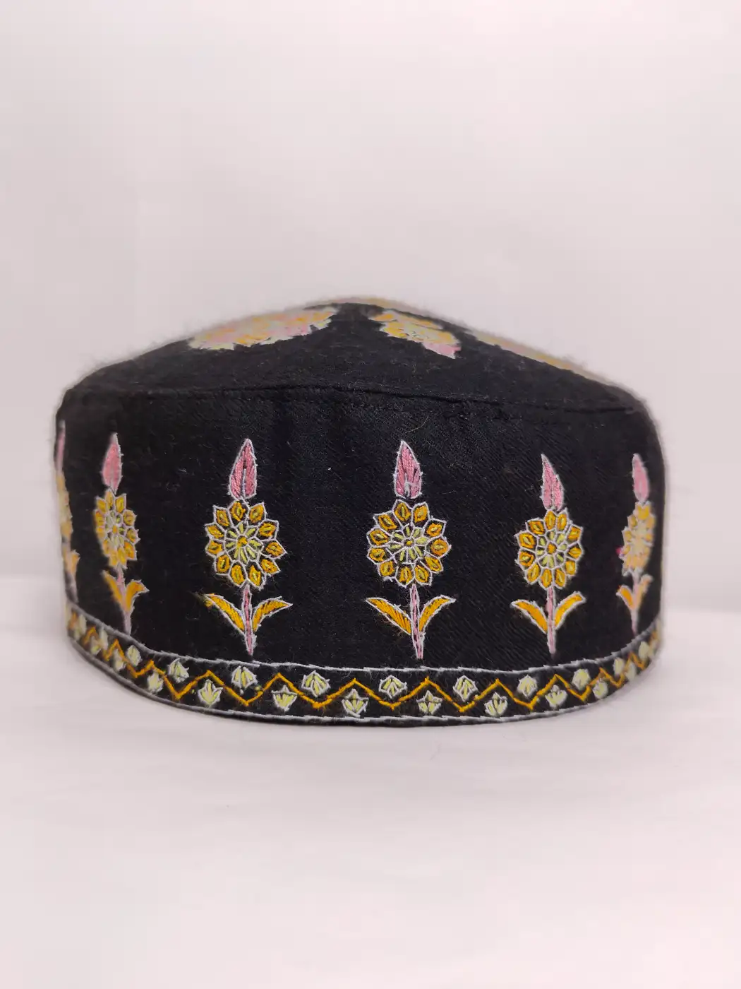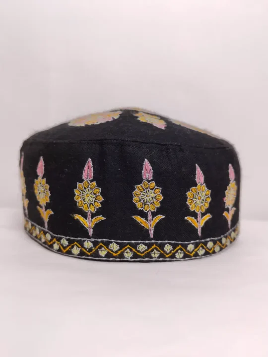 Black pure pashmina gives this stylish pashmina sozni cap its soft refined base. The crown carries a bold five motifs while the sides are filled with continuous hand sozni embroidery, making this topi a graceful reflection of traditional Kashmiri needlework.