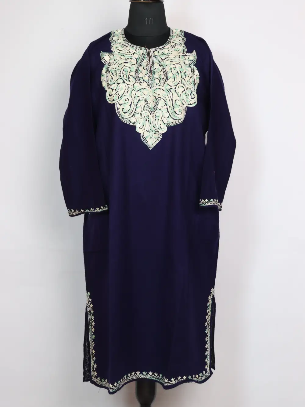 Azra Cashmilon Wool Pheran Dark Blue with Aari Work