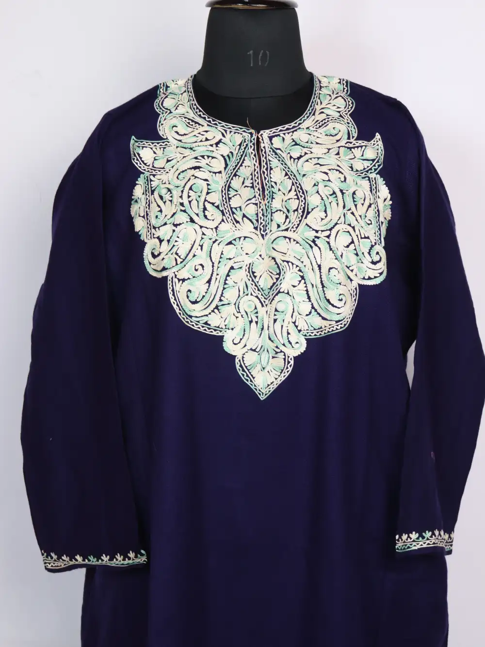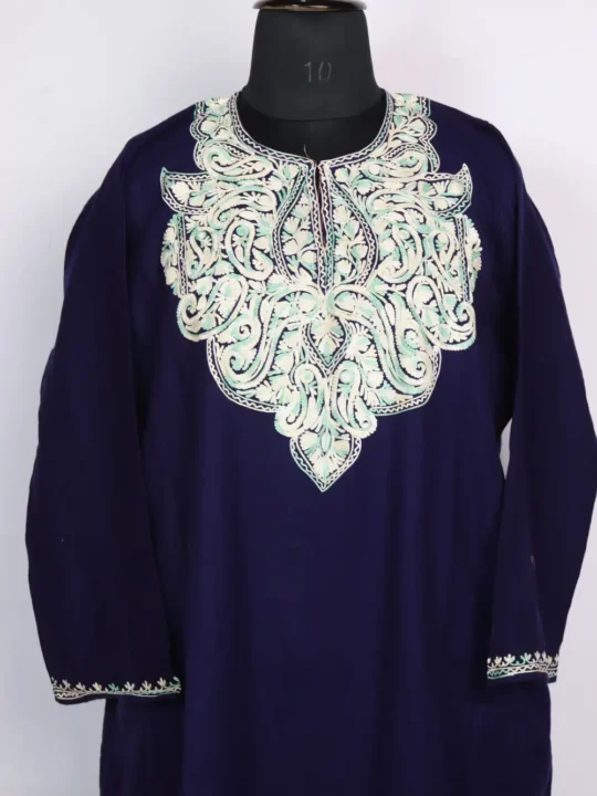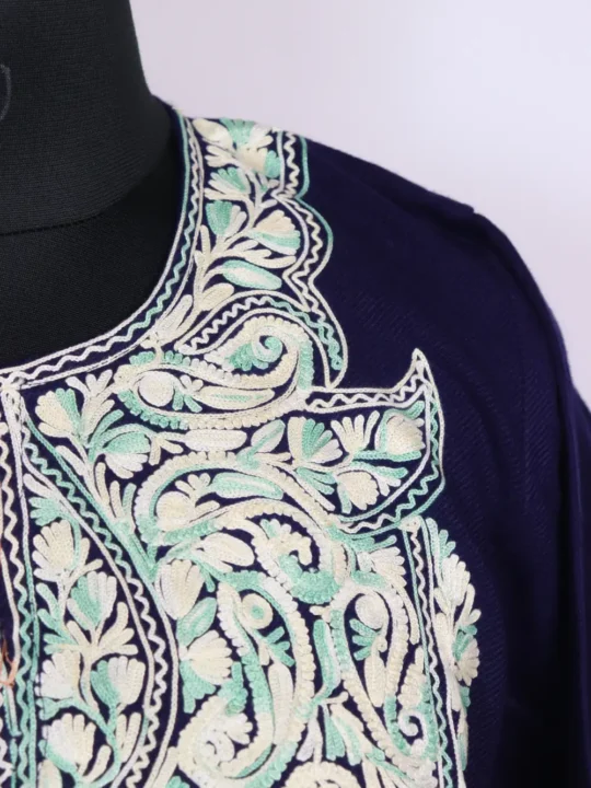 This beautiful cashmilon wool pheran in a dark blue tone is adorned with badam shaped aari embroidery in beautiful colour around the neckline. The soft fabric, elegant and warm feel make it a must-have for winter elegance.