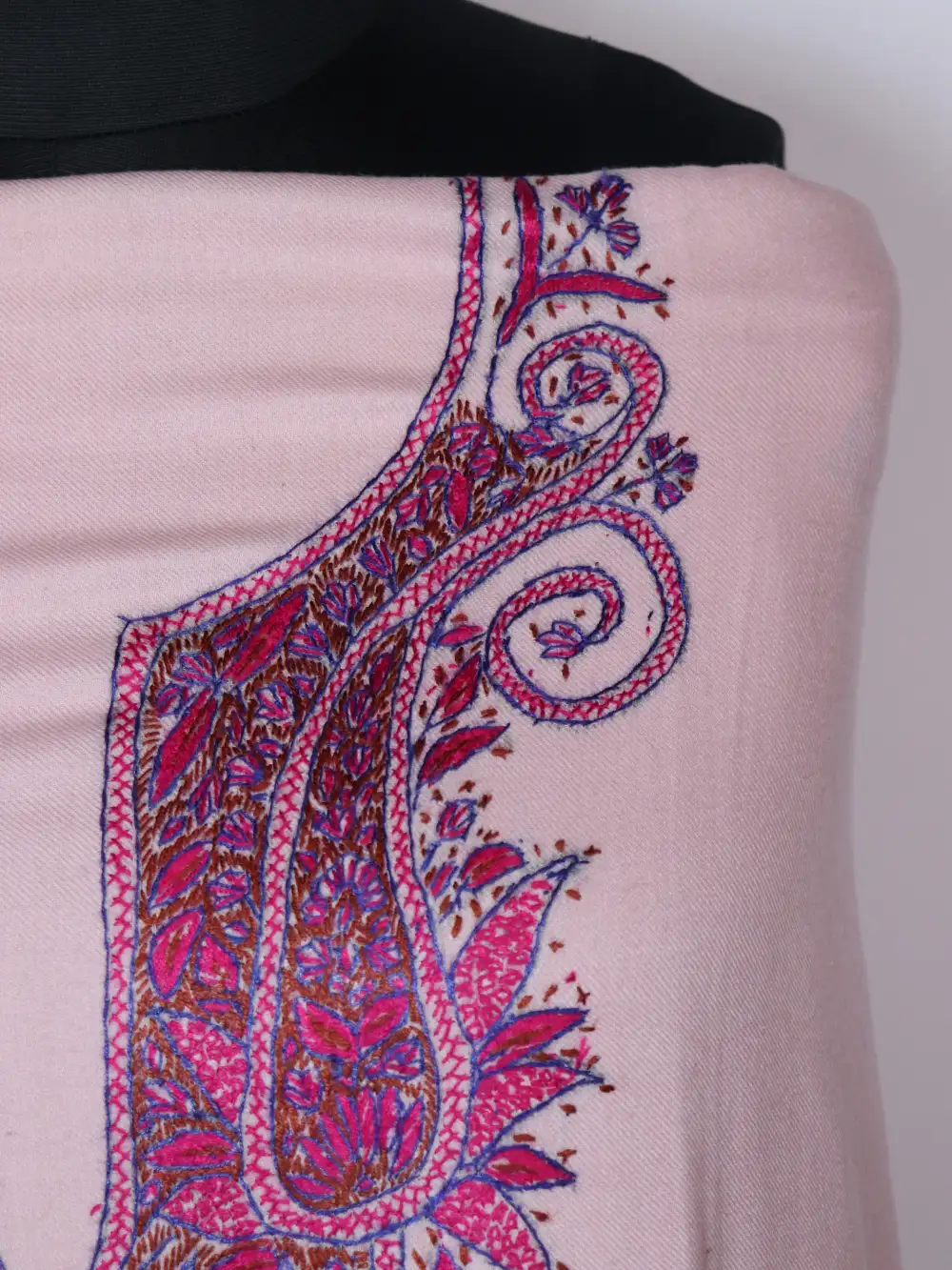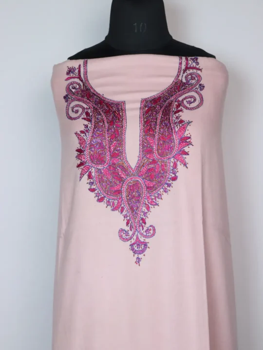 Warm pure wool fabric comes with 3pc set, with hand sozni paper machie badam embroidery around the neckline. The set is unstitched and includes kameez, salwar, and dupatta for a personalized stitch