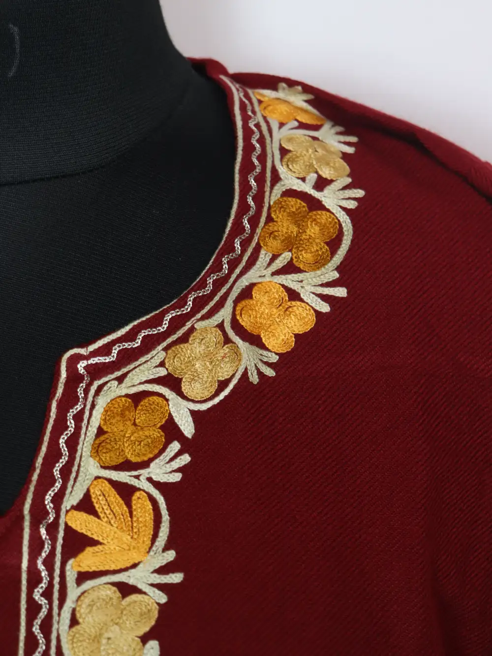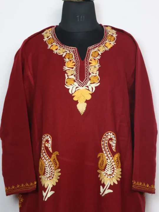 Crafted using cashmilon wool, this maroon colour Kashmiri traditional phiran dress features aari and zari embroidery arranged across the neckline and front panel in booti style.