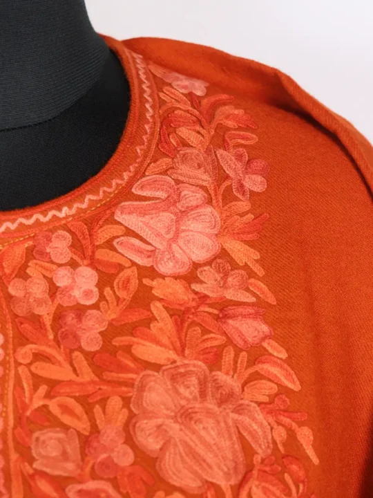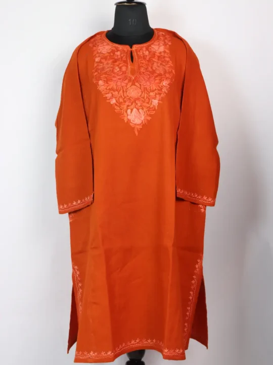 Warm and cozy, the bahaar pheran in rustic orange hue Raffal wool showcases elegant orange shaded floral Aari embroidery at the neckline. Measuring 44 inches in length with a 53-inch chest, this pheran drapes lightly and allows you easy movement. Both-side pockets make the pheran practical for everyday wear. It comes under 2500 rupees, this pheran blends softness, elegance, and seasonal functionality for winter layering.