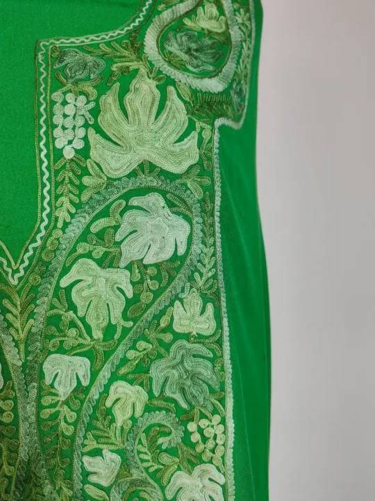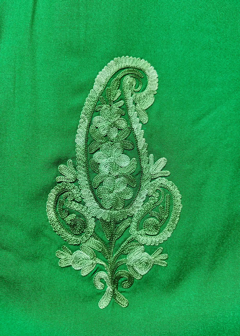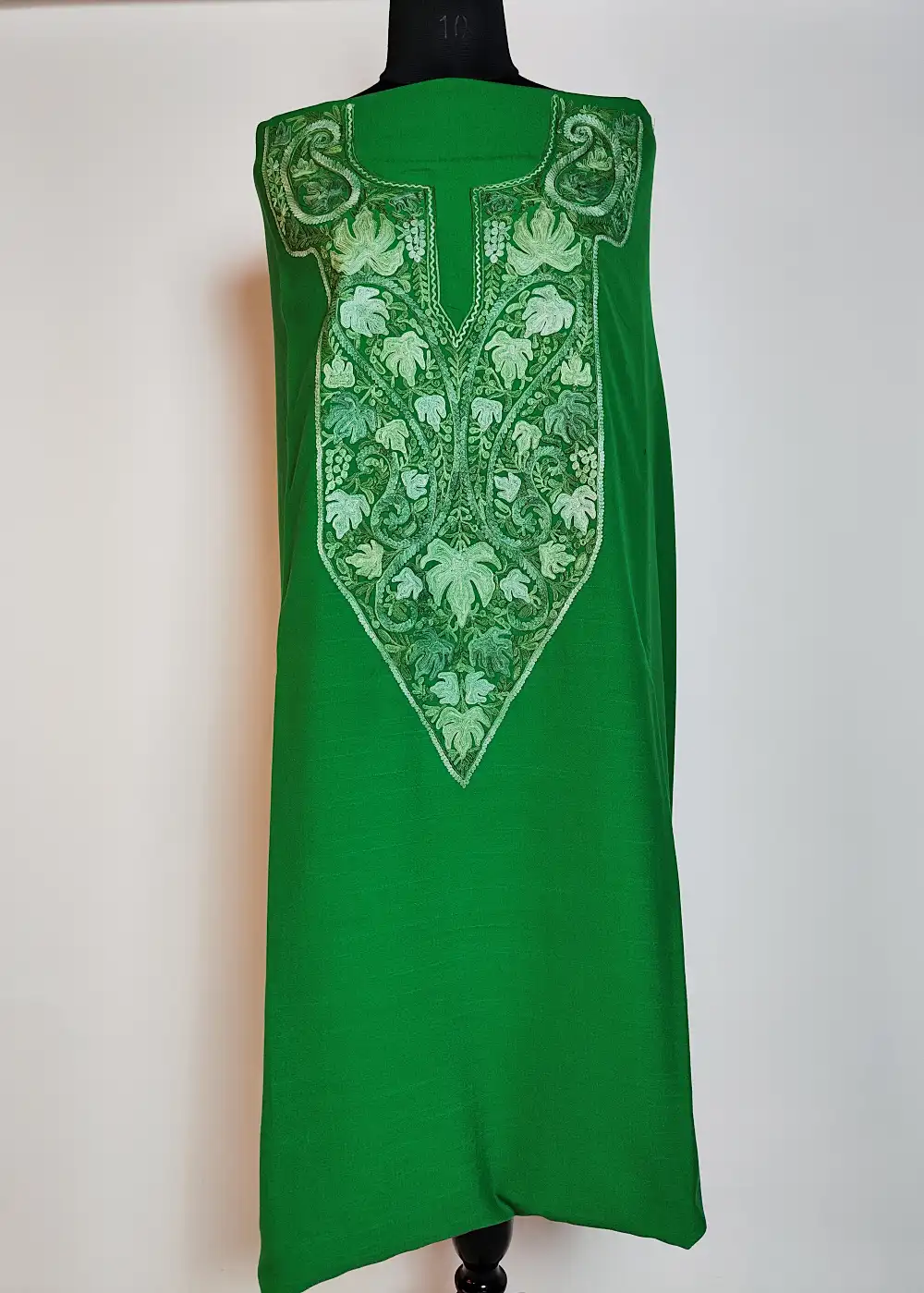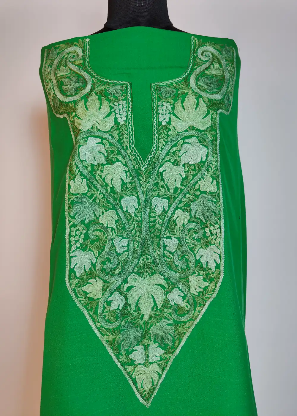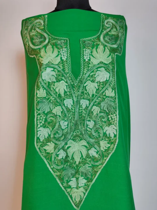 This Kashmiri suit material in summer cool cotton has fine badam and floral Aari embroidery done neatly around the neckline, giving it a soft and traditional front look. The fabric feels easy and comfortable for warm days and daily wear. It is offered unstitched so you can stitch it the way you like and get the fitting just right.