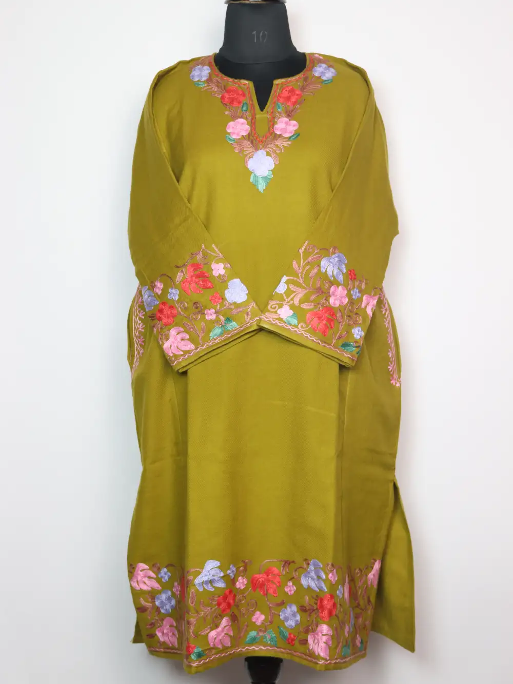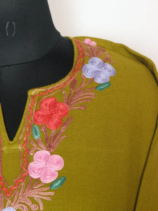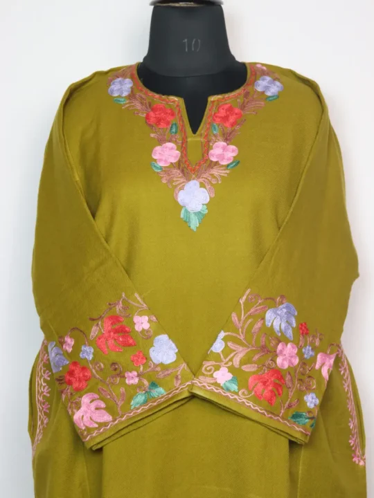Stitched in cashmilon wool for cold season dressing, this phiran comes in mehndi green colour. It features aari embroidery with floral and chinar motifs on neckline, sleeves and border.