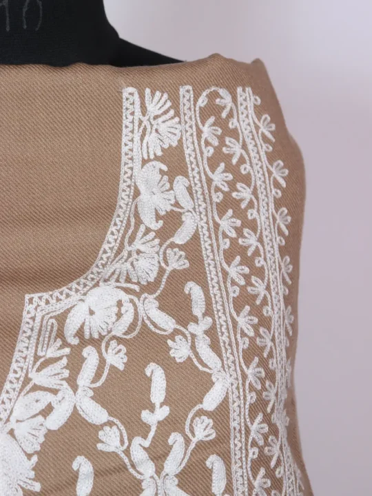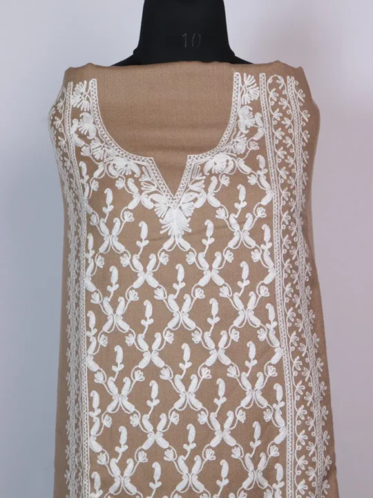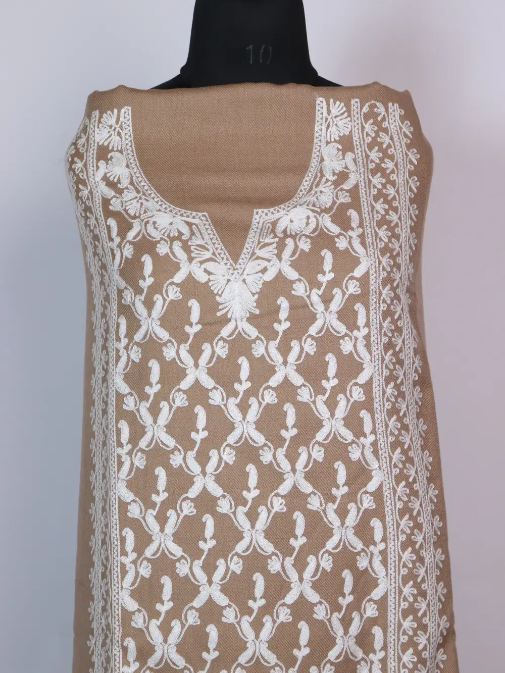 Warm beige color cashmilon wool creates this garam suit, presented as an unstitched 2pc Suit for tailored fit. The front panel is filled with white badam style geometrical embroidery in Aari work, which offers a winter-ready design. It has been perfectly placed among embroidery suits for women or woolen suit material, this 2pc Suit combines comfort and artistic embroidery for those who are seeking winter elegance.