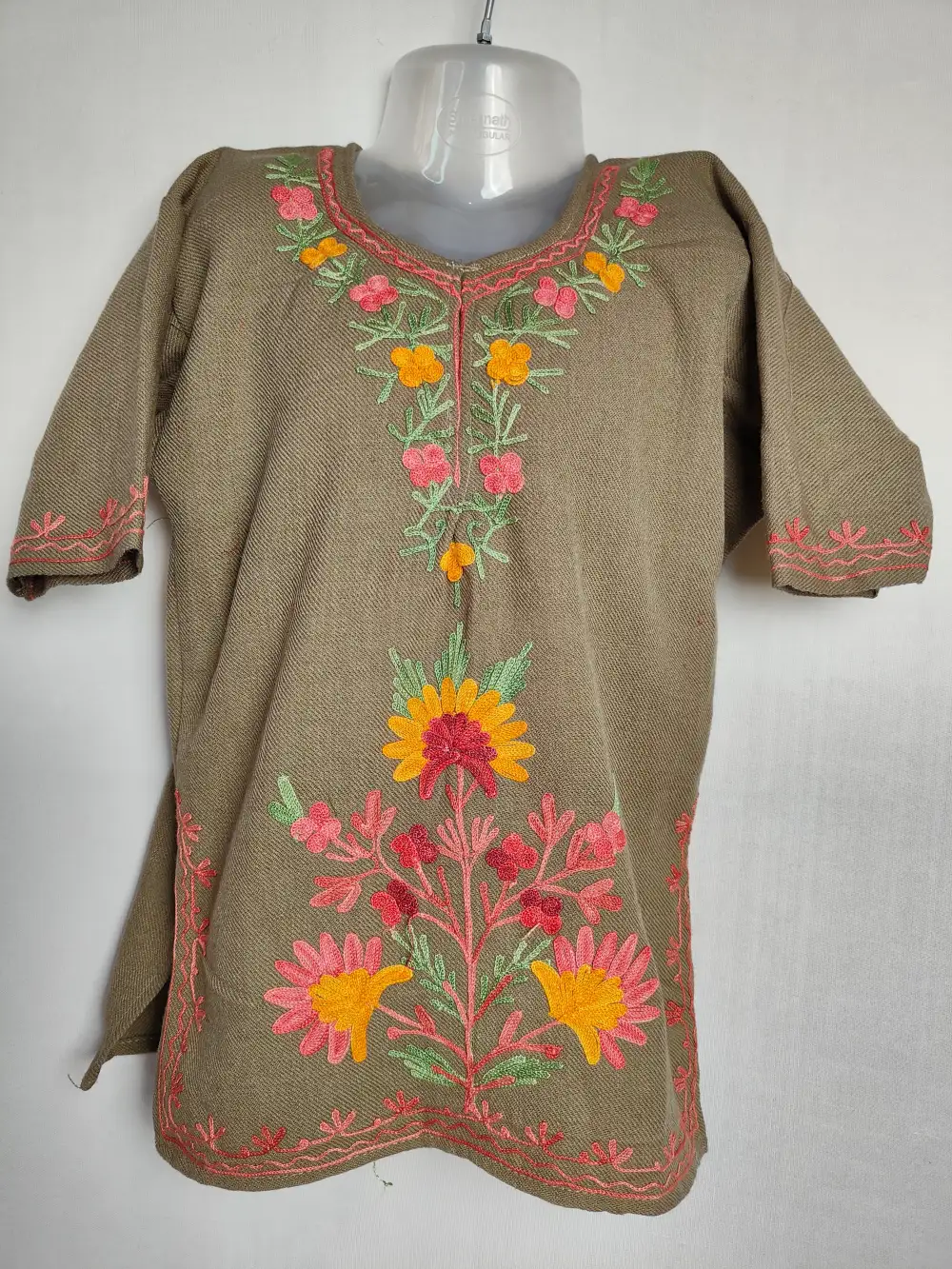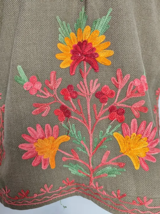 Made from soft Cashmilon fabric, the garam Pheran for 2-3 year-old girls combines warmth and comfort for winter days. Its neckline and front panel carries floral Aari embroidery in mustard, red and green hue threads, which lends a gentle charm to the beige shade. It is tailored to a 30-inch chest and 22-inch length. It is loved for its easy fit and cozy softness, this pheran is a timeless pick among Kashmiri kids pheran styles