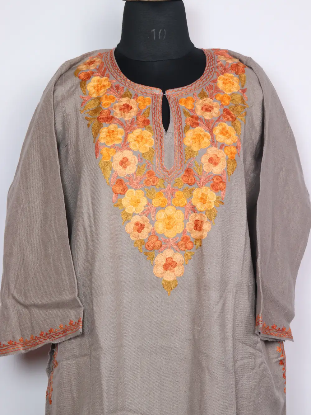 Cashmilon wool beige hue pheran brings calm structure and useful detailing; it has pockets both side for functional ease while retaining a graceful fit. Aari embroidery at the neckline is styled with floral motifs that add texture and subtle shine.