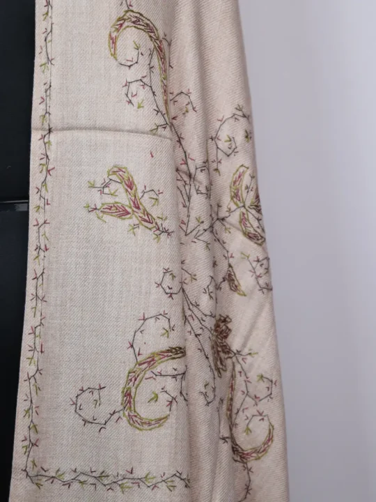 Designed in soft cashmilon fabric, this women stole is styled in beige colour. It showcases hand sozni embroidery on border with floral corner detailing.