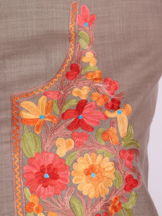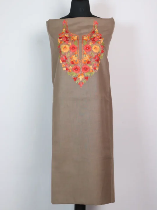 Ruby cotton fabric gives this beige color unstitched 2pc suit a soft feel, makes it ready to be stitched in your fit. The neckline has been enriched with Aari embroidery—floral motifs in red and yellow hue, paired beautifully with leafy details in green threads. This combination adds subtle artistry, lifting the plain fabric. It is comfortable and versatile, it’s a piece that you can turn into a graceful and reliable outfit.