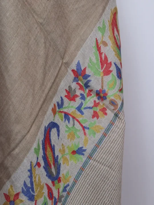 A fine wool Kani palla stole with clean floral, badam and stripe designs on the palla. It feels comfortable, warm, and easy to carry through the day.