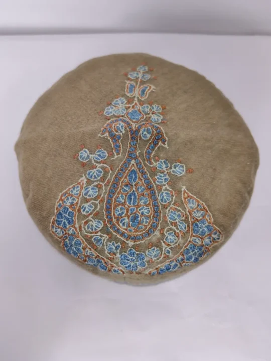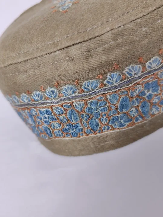 This dark beige hue cap has a central paisley design that anchors the pattern while delicate floral details spread around it. The side panel of this handmade cap carries a continuous embroidered strip of small blossoms. Crafted with care, it features intricate hand sozni embroidery which have been arranged thoughtfully across the crown.