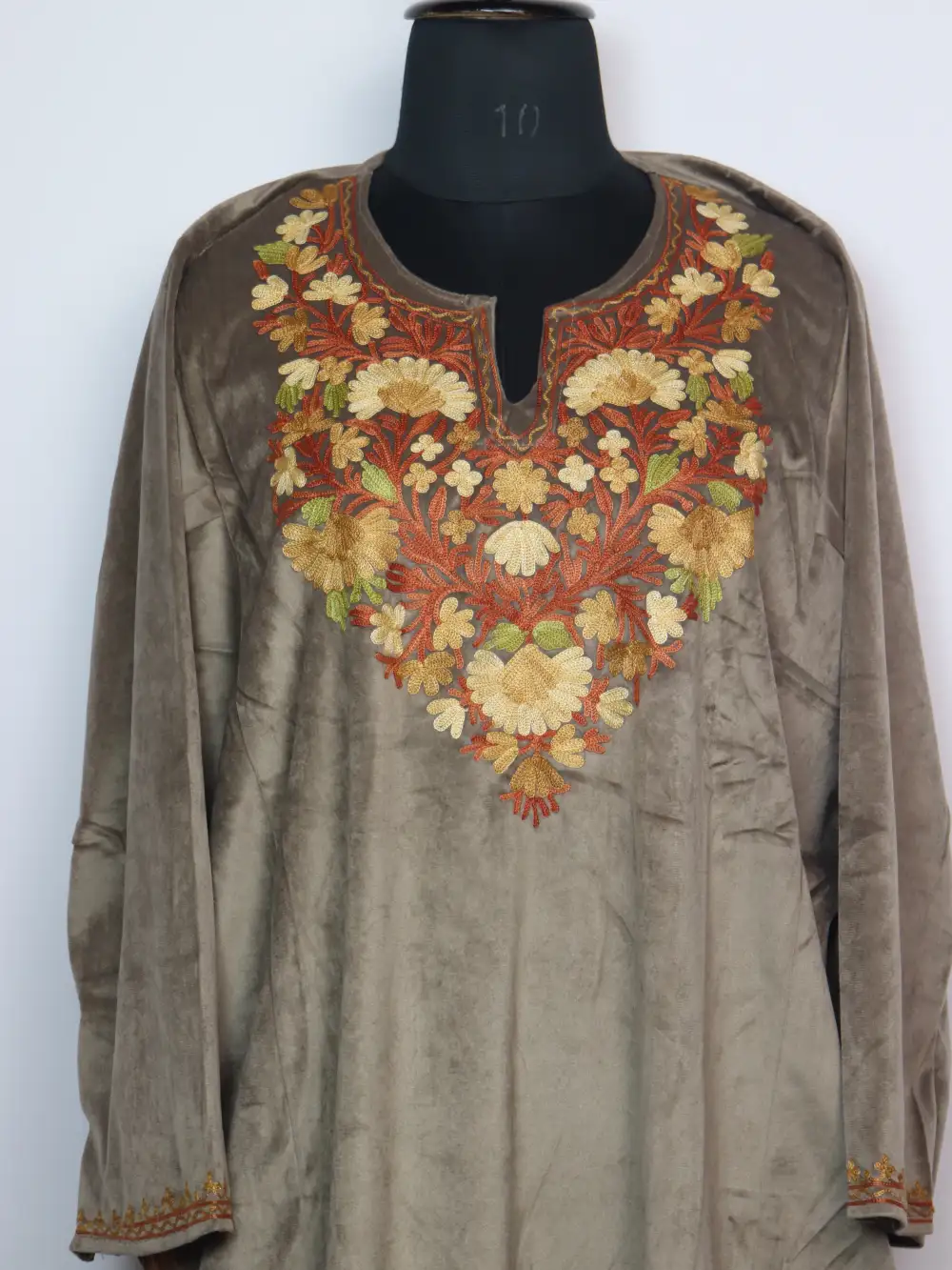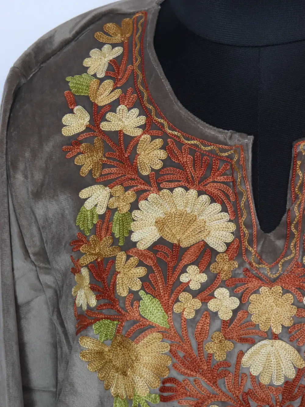 Made using velvet fabric, this beige colour pheran highlights aari embroidery around the neckline in floral motifs with subtle detailing. It has pockets on both sides which enhance everyday ease.