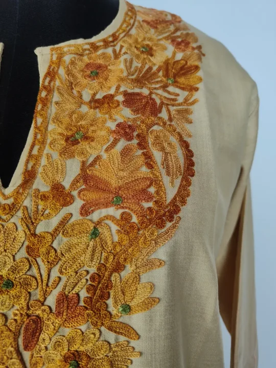 Prepared in ruby cotton for airy comfort, this beige colour best cotton kurtas features Kashmiri aari embroidery at neckline in floral and badam motifs. It comes in 42 inches chest and 39 inches length which offers soft and relaxed wear.