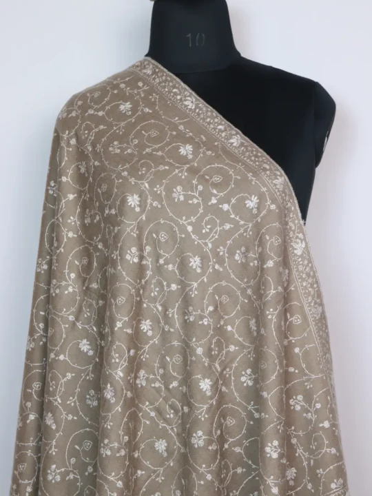 Crafted from pure Kashmiri pashmina, this elegant beige shawl is designed for warmth, comfort, and timeless grace. The surface is adorned with hand-done Sozni embroidery, featuring delicate floral jaal patterns spread evenly across the body, reflecting the finesse of Kashmiri craftsmanship.