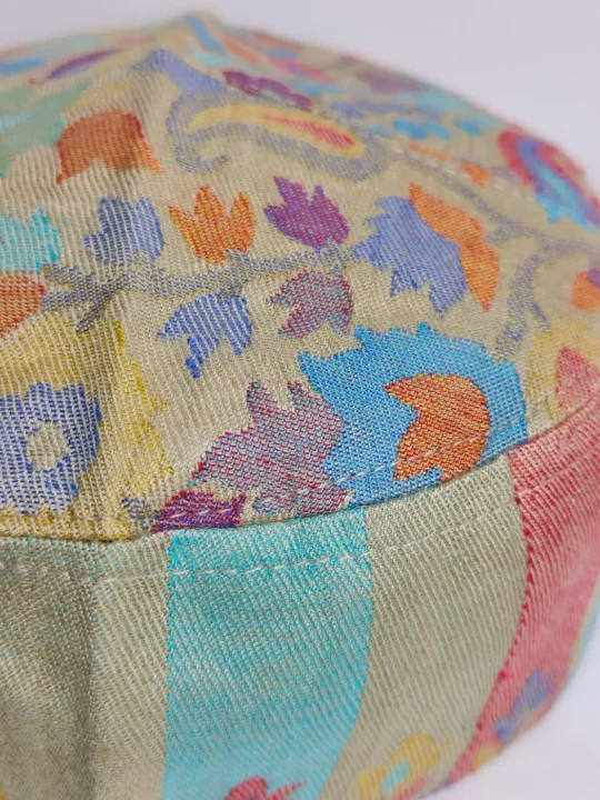 Inspired by Kashmiri weaving tradition, this beige round Kani cap for men is crafted from woven kani shawl fabric. Its floral motifs highlight the crown while continuous lakeer embroidery decorates the sides. This cap for men presents refined heritage detailing.