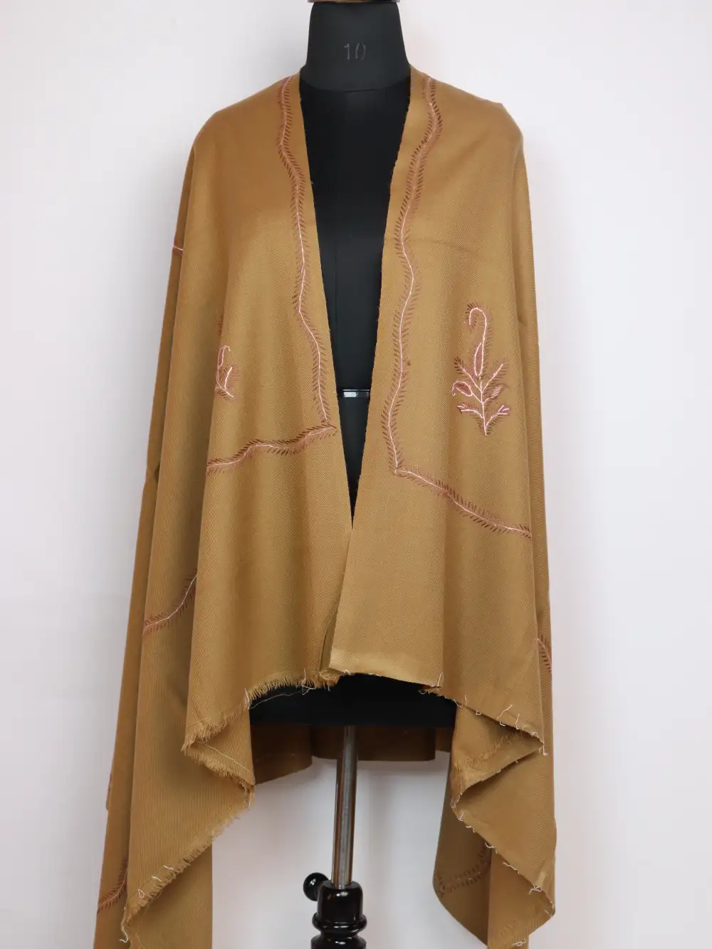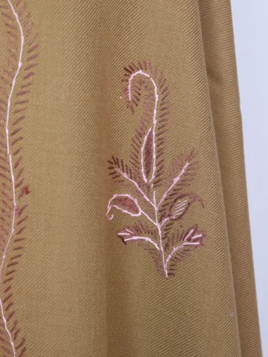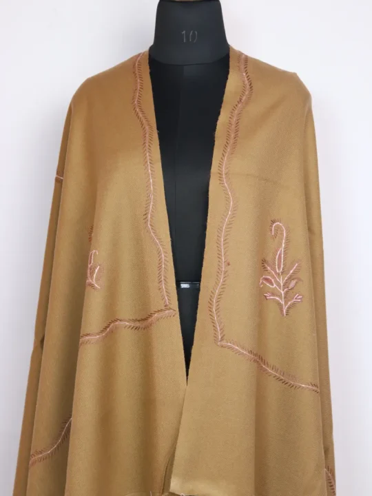 A beige colour shawl from Kashmir in Cashmilon Wool with continuous Hand Sozni embroidery at the border and floral motifs at the corners — it has been made for women who like subtle craft. This shawl from Kashmir offers a soft, textured finish and is priced at 1299, it is a modest value for hand-stitched work.