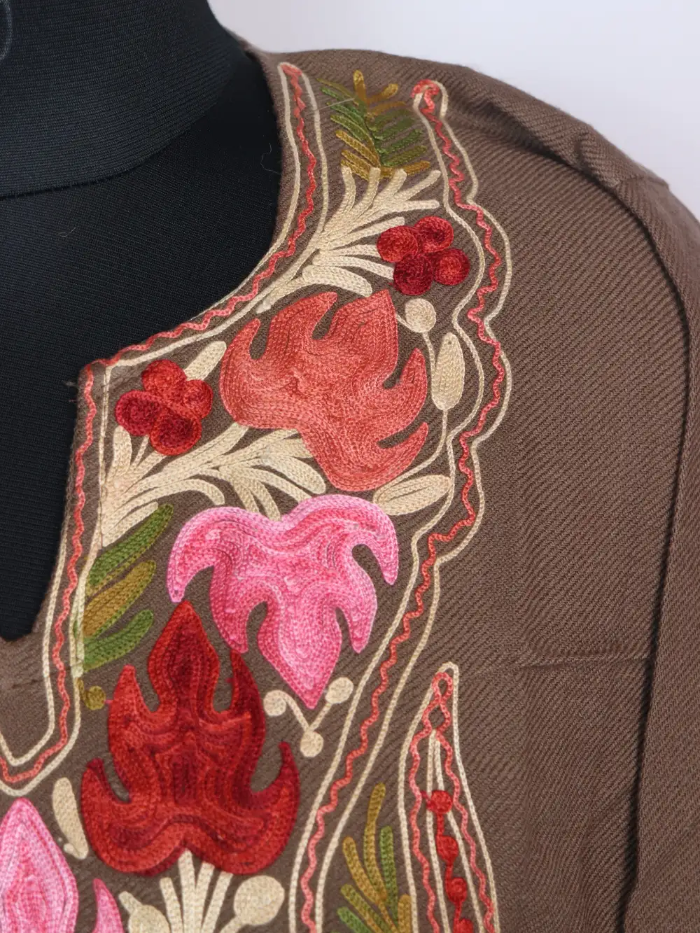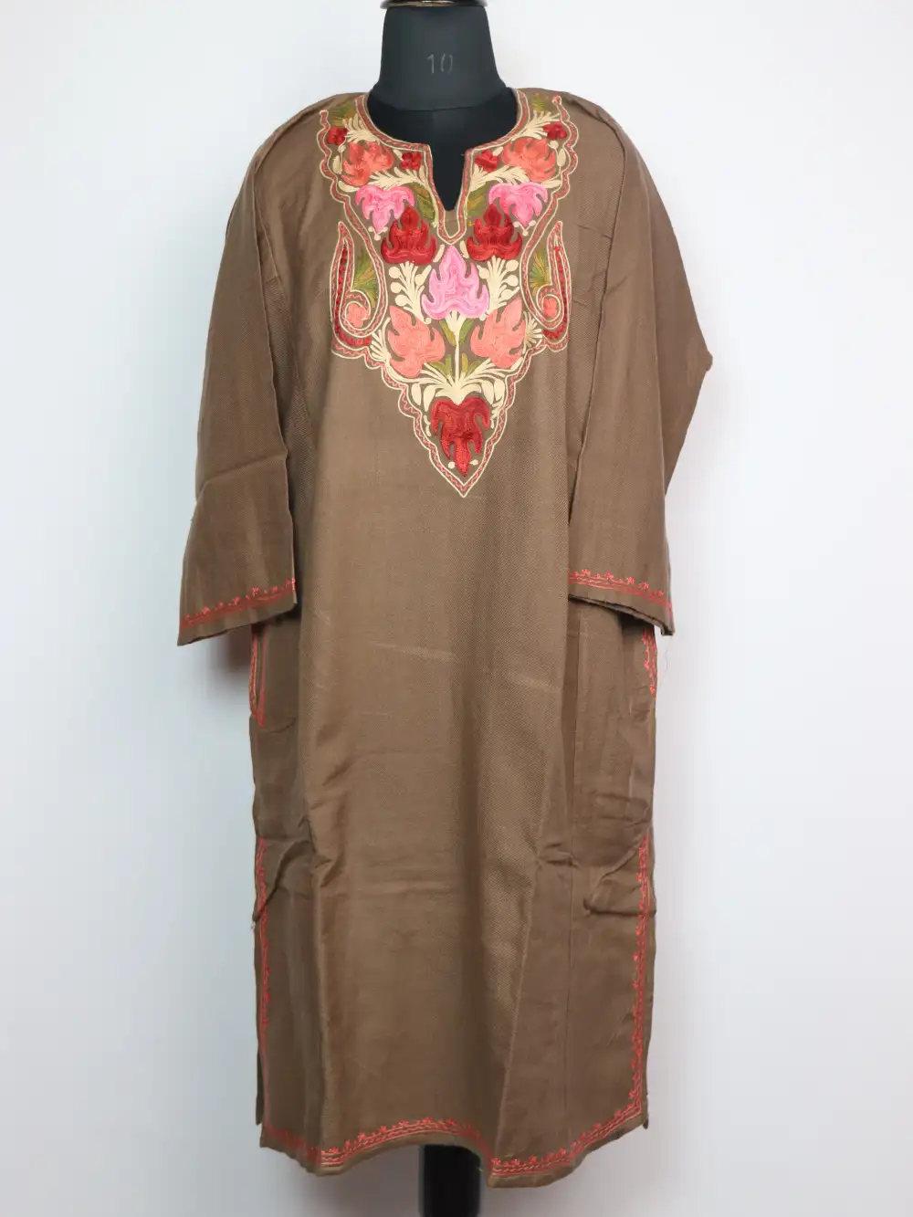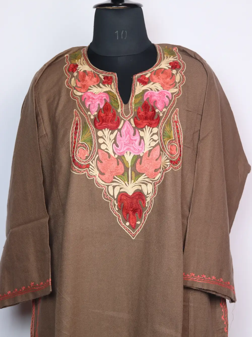 Comfortable cashmilon wool makes this firan perfect for cold weather, and the chinari aari kadhai around the neckline adds a lovely traditional charm.