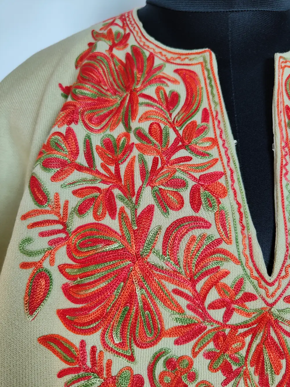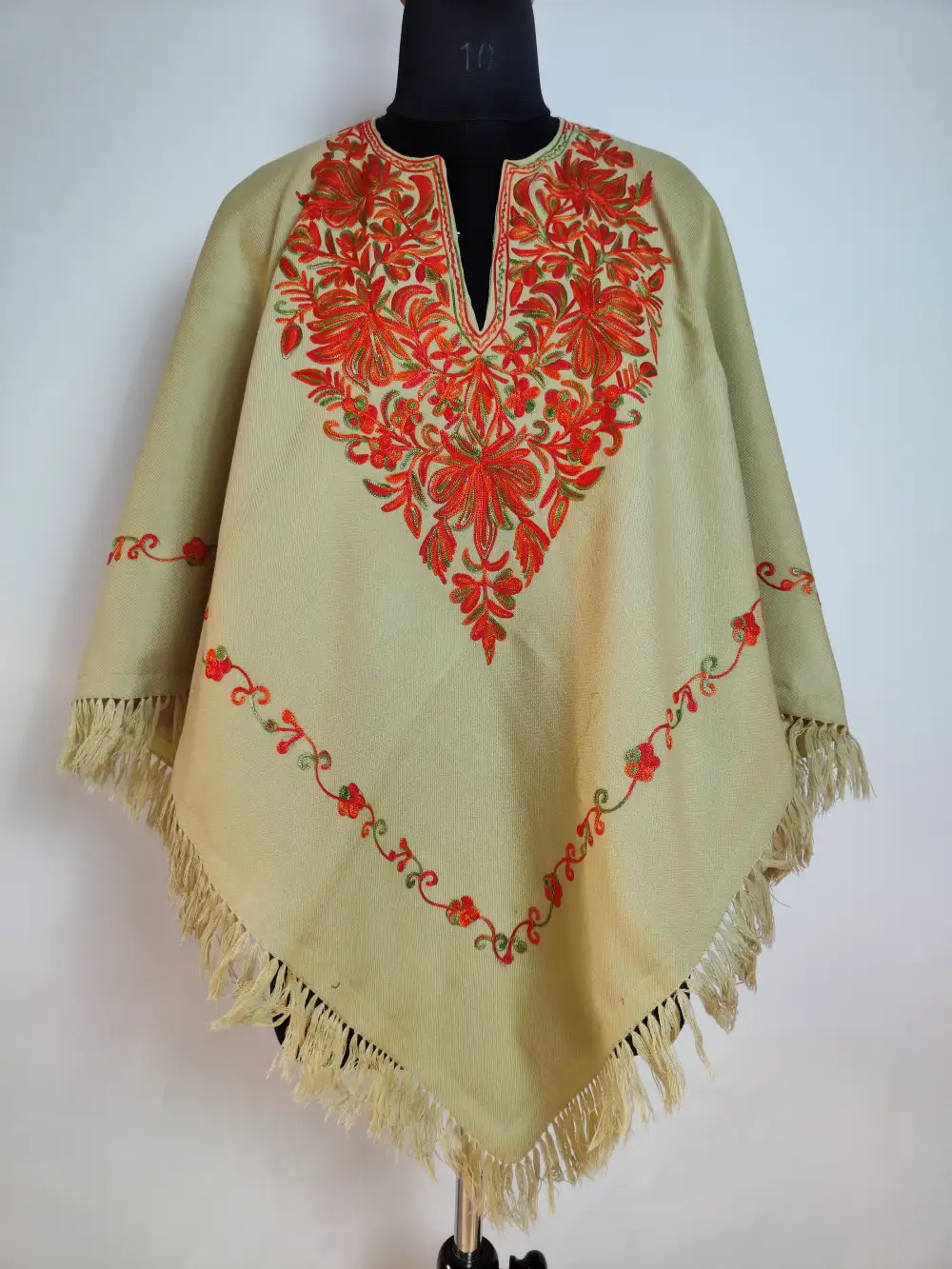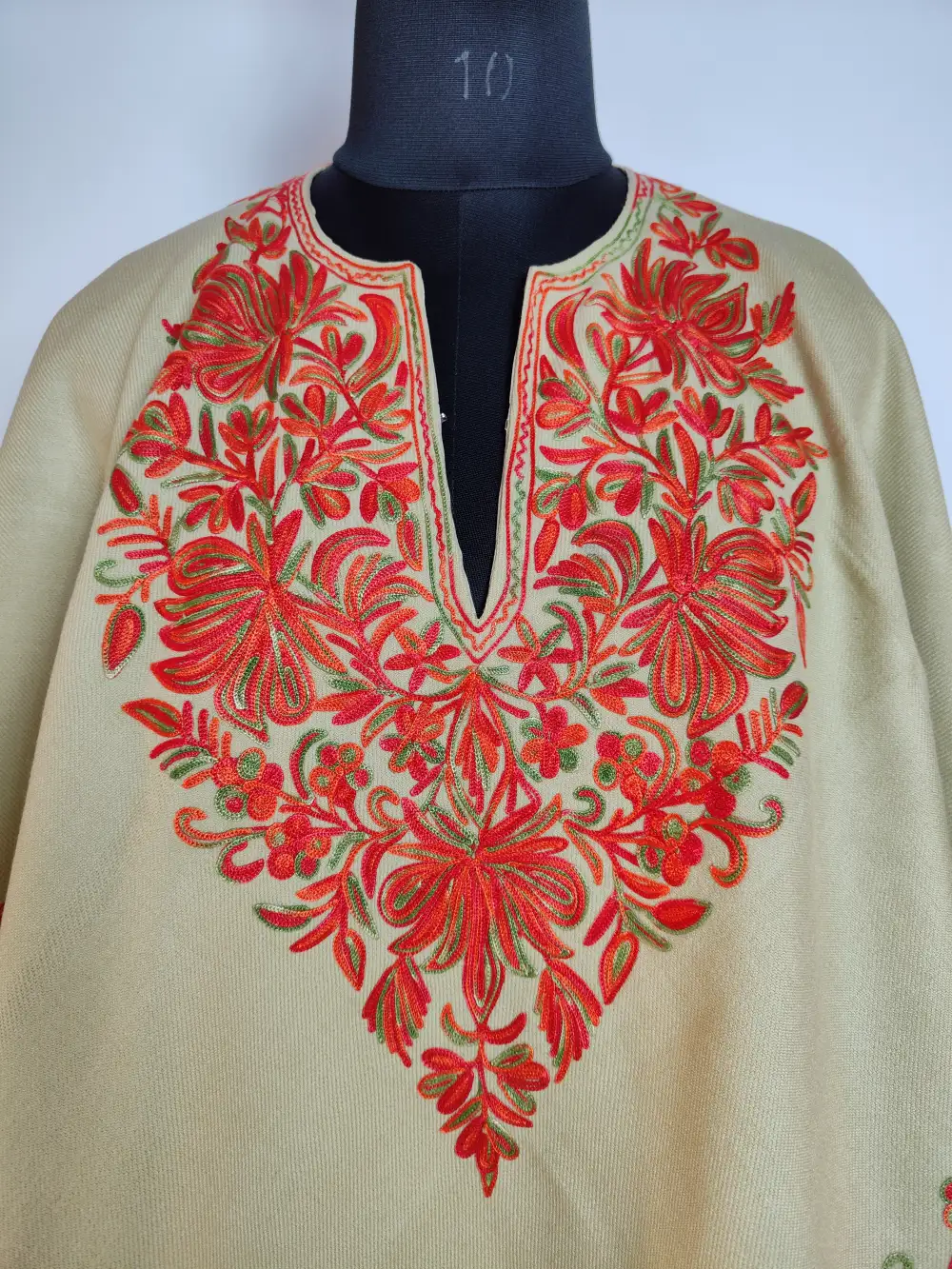 A neatly cut beige colour Kashmiri poncho in Cashmilon wool adorned with floral Aari at neckline and continuous near-border embroidery, side-by-side it is 65 inches, length is 32 inches and it comes with lining.