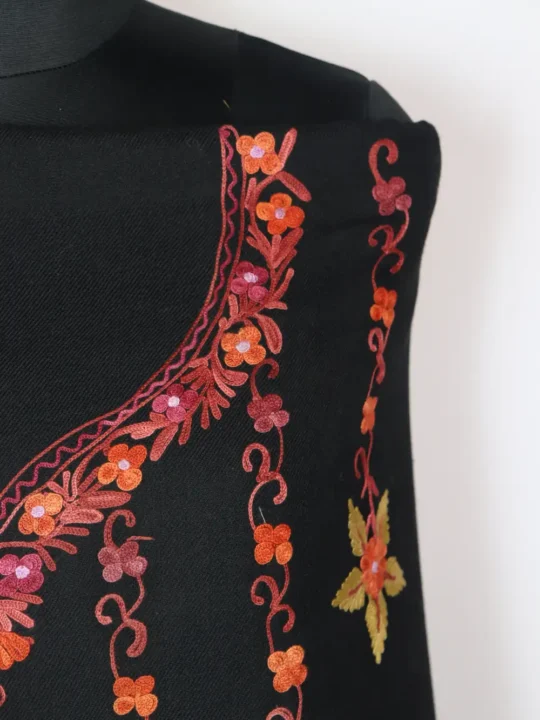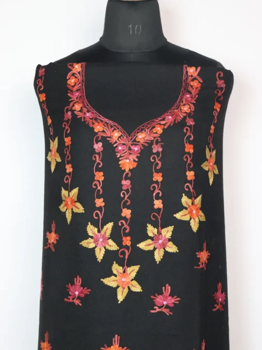 This 3pc poly wool suit provides natural warmth and displays aari floral work around neckline and bottom with bootis all over. It comes unstitched with kameez, salwar, and dupatta so you can adjust the fit as per your choice.