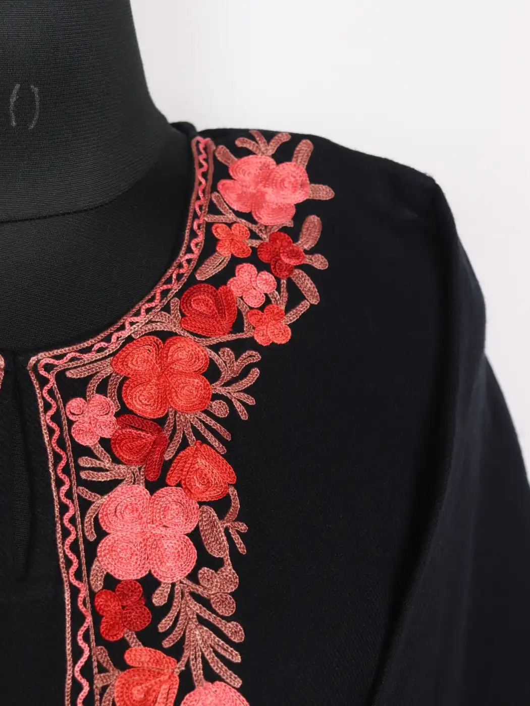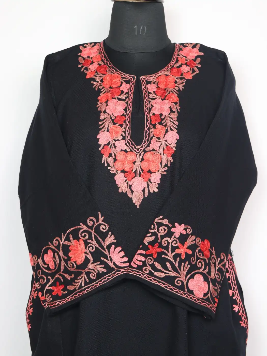 Warm wool fabric and floral aari embroidery bring a clean Kashmiri feel to this feran. It comes with a 50 inch chest and 44 inch length. It has pockets on each side.