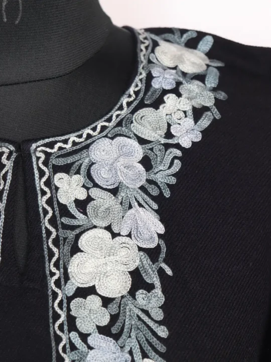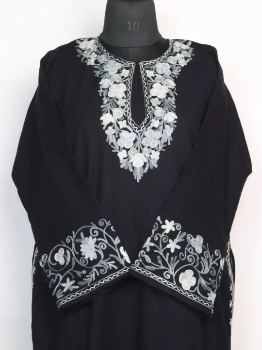 A green pheran in Cashmilon Wool features floral pattern Aari kadhai at the neckline and jaal pattern work at sleeves and border. Its pockets on both side for practical ease.