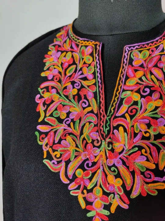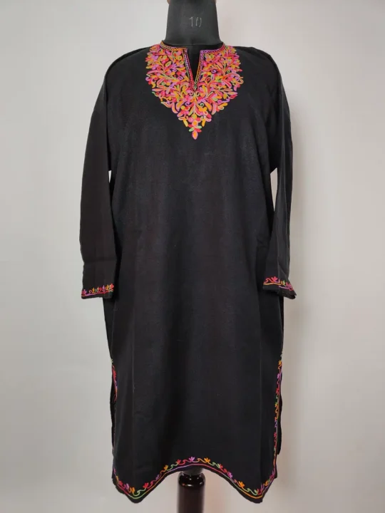 A soft touch of warmth and colour defines this yellow Cashmilon pheran. The neckline is decorated with red and green floral Aari work which lends it beauty. Its 40-inch length makes it a great everyday fit. As it comes under price 1300, it’s an affordable piece which captures both comfort and design, perfect for brightening winter wardrobes.