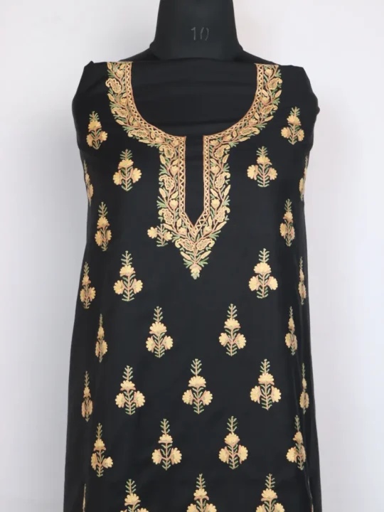This black spun 2pc Suit is unstitched for easy custom tailoring, It comes with Aari kadhai with floral motifs at neckline and booti style work all over it. This black kashmiri 2pc garam Suit holds a neat Kashmiri neck accent and lets your tailor finish it as you prefer.