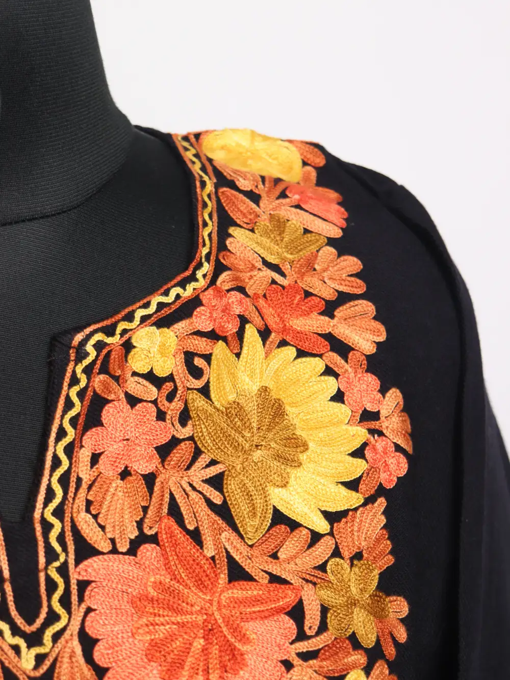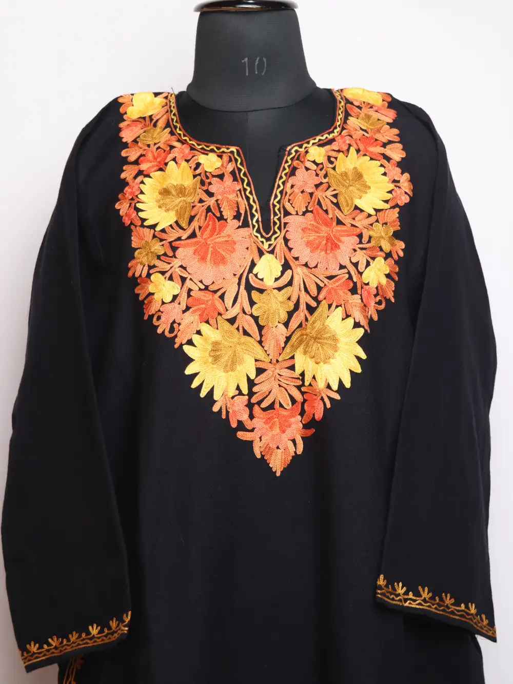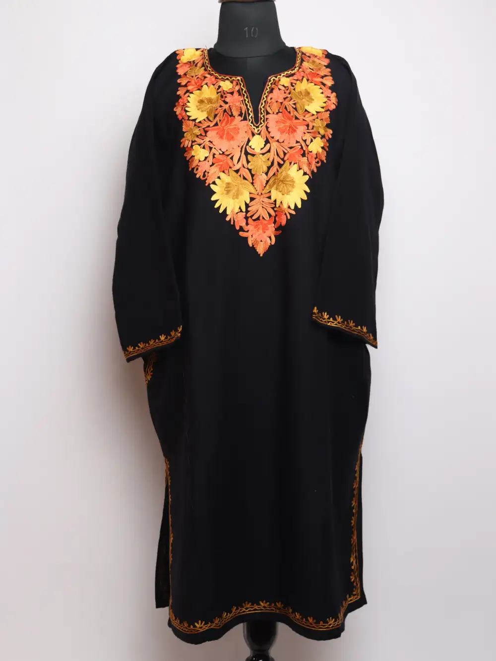 Soft cashmilon wool shapes this black pheran with floral Aari embroidery at the neckline. It includes pockets on both sides add everyday ease.