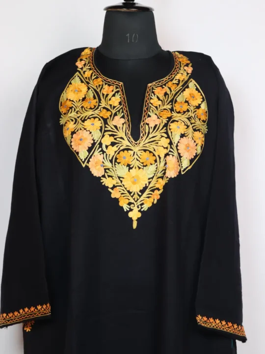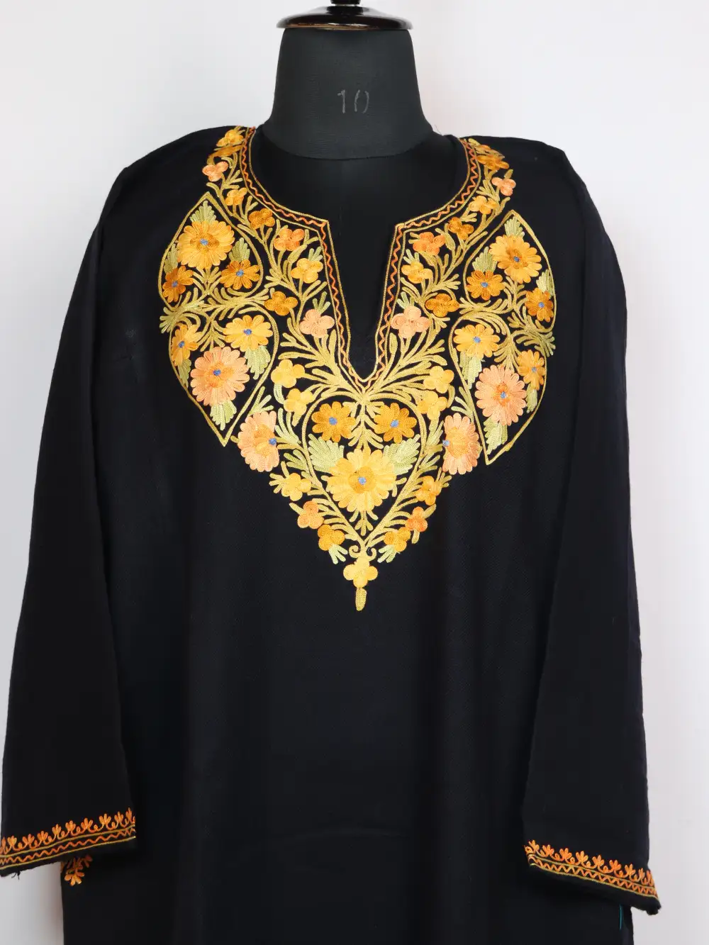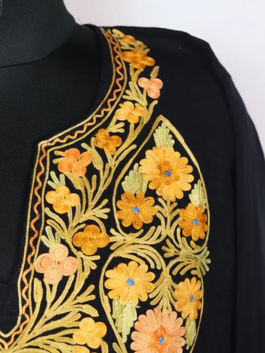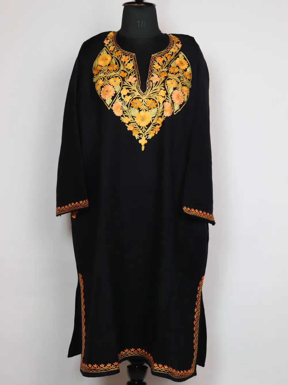 Cashmilon Wool phiran in Black colour shows Aari embroidery at the neckline in lovely floral patterns. It comes in chest size 52 inches length 43.5 inches that gives comfortable layering.