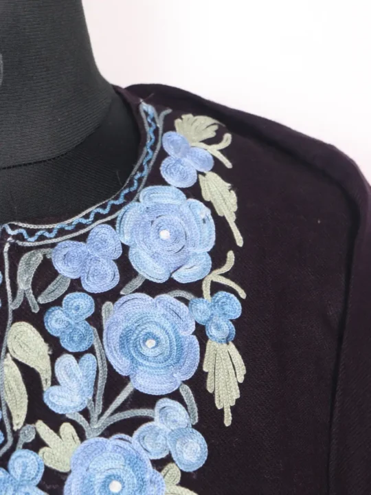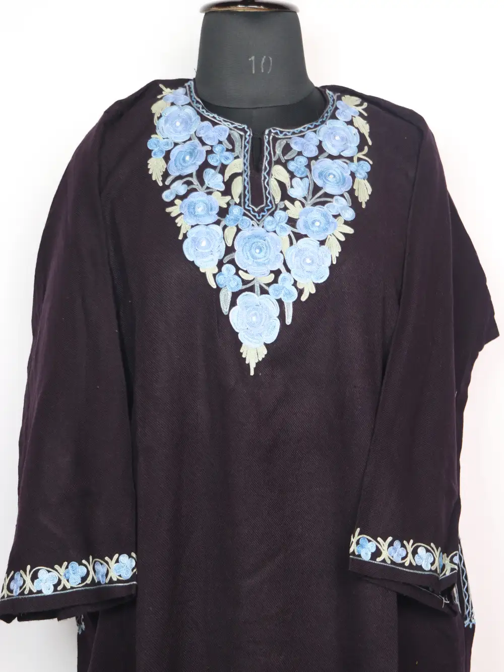 Made in Kashmir, this black cashmilon wool pheran set arrives as a 2pc set with trouser and it shows Aari work at the neckline where clustered blooms and tendrils are stitched to form a refined band. It has a chest size 51 inches and length 43 inches which ensure easy layering.