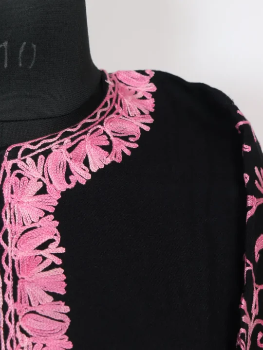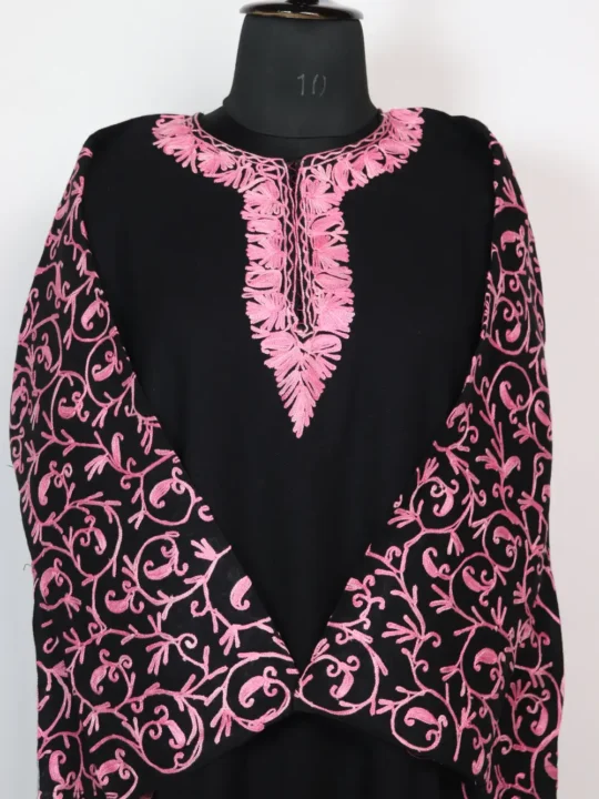 Soft Cashmilon Wool makes the base of this black Pheran while aari badam embroidery in pink threads at the neckline and jaal style patterns at side panels and sleeves frames the face. This pheran measures 48 inch chest size and 43 inch length and has side pockets for everyday use. For easy purchase and seasonal dressing you can order this pheran online directly, and it will add a quiet, traditional note to your winter wardrobe.