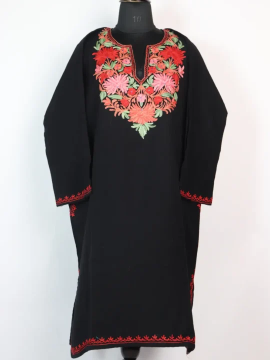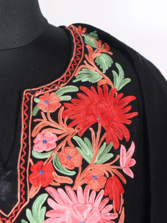 This black pheran, designed in soft cashmilon wool, is warm and elegant. Its embroidery decorates the neckline with red and pink floral motifs, while the fabric is further enriched with green leaf designs. It is a garment that feels light but holds the coziness needed for colder days, it balances practical comfort with artistic detailing. Stylish and versatile, it fits perfectly into daily winter wear.