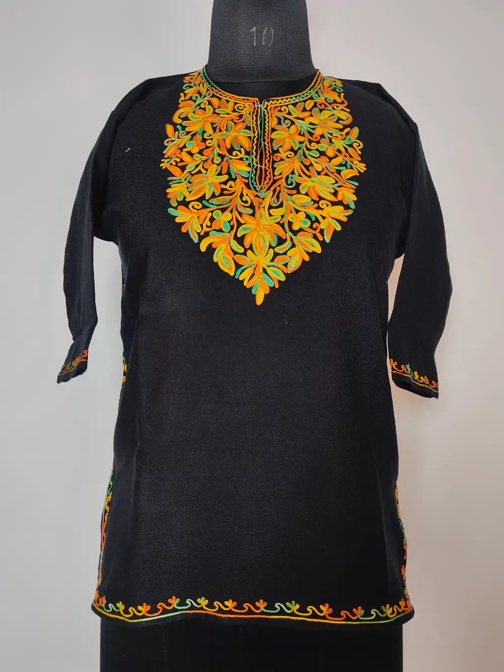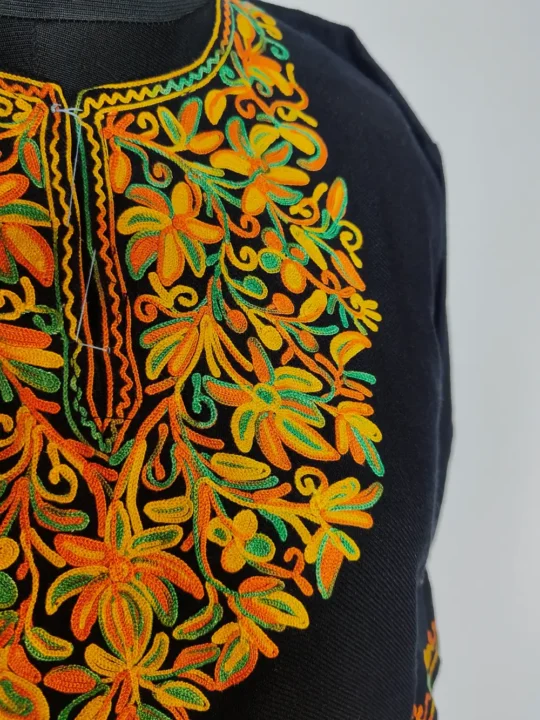 Made for 5-6 year kids this black Kashmiri faran is crafted in cashmilon wool, touched with floral aari embroidery blooming around the neckline. Its chest size 36 and length 25 inches wraps little ones in comfort and elegance.